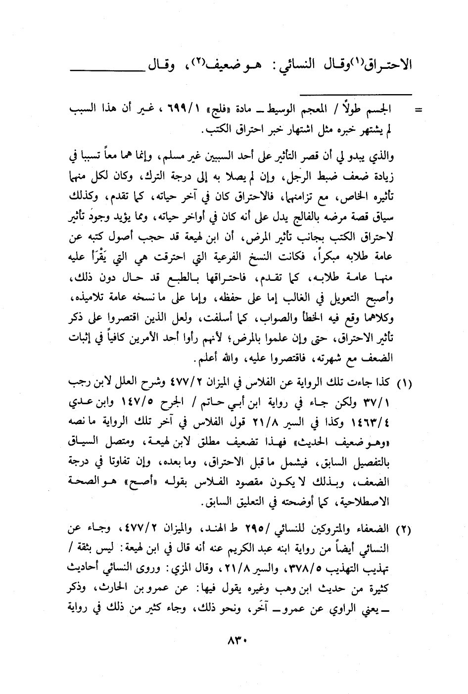 (¬1) كذا جاءت تلك الرواية عن الفلاس في الميزان 2/ 477 وشرح العلل لابن رجب 1/ 37 ولكن جاء في رواية ابن أبي حاتم/ الجرح 5/ 147 وابن عدي 4/ 1463 وكذا في السير 8/ 21 قول الفلاس في آخر تلك الرواية ما نصه "وهو ضعيف الحديث" فهذا تضعيف مطلق لابن لهيعة، ومتصل السياق بالتفصيل السابق، فيشمل ما قبل الاحتراق، وما بعده، وإن تفاوتا في درجة الضعف، وبذلك لا يكون مقصود الفلاس بقوله "أصح" هو الصحة الاصطلاحية، كما أوضحته في التعليق السابق.