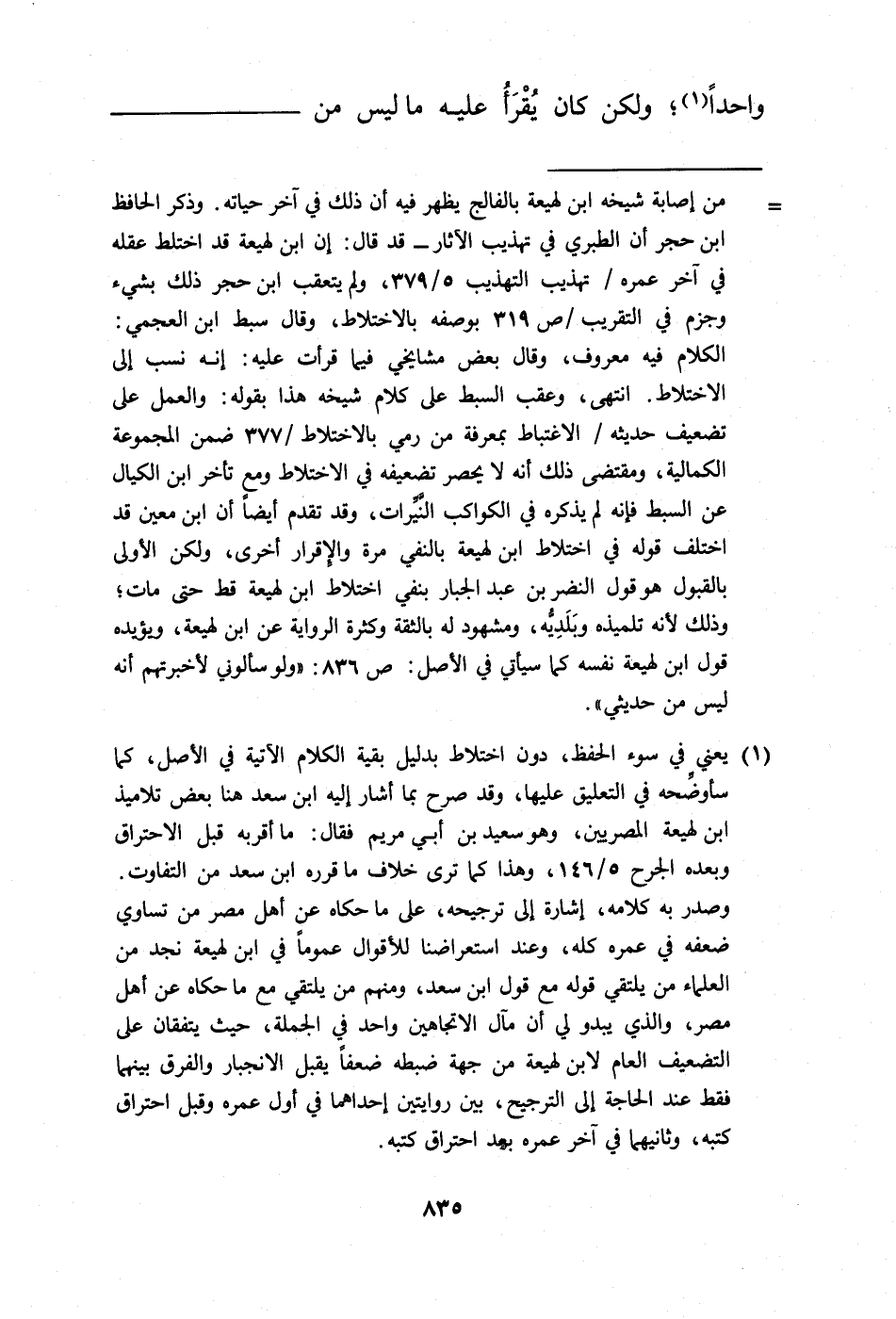 = من إصابة شيخه ابن لهيعة بالفالج يظهر فيه أن ذلك في آخر حياته. وذكر الحافظ ابن حجر أن الطبري في تهذيب الآثار - قد قال: إن ابن لهيعة قد اختلط عقله في آخر عمره/ تهذيب التهذيب 5/ 379، ولم يتعقب ابن حجر ذلك بشيء وجزم في التقريب/ ص 319 بوصفه بالاختلاط، وقال سبط ابن العجمي: الكلام فيه معروف، وقال بعض مشايخي فيما قرأت عليه: إنه نسب إلى الاختلاط. انتهى، وعقب السبط على كلام شيخه هذا بقوله: والعمل على تضعيف حديثه/ الاغتباط بمعرفة من رمي بالاختلاط/ 377 ضمن المجموعة الكمالية، ومقتضى ذلك أنه لا يحصر تضعيفه في الاختلاط ومع تأخر ابن الكيال عن السبط فإنه لم يذكره في الكواكب النَّيِّرات، وقد تقدم أيضًا أن ابن معين قد اختلف قوله في اختلاط ابن لهيعة بالنفي مرة والإقرار أخرى، ولكن الأولى بالقبول هو قول النضر بن عبد الجبار بنفي اختلاط ابن لهيعة قط حتى مات؛ وذلك لأنه تلميذه وبَلَدِيُّه، ومشهود له بالثقة وكثرة الرواية عن ابن لهيعة، ويؤيده قول ابن لهيعة نفسه كما سيأتي في الأصل: ص 836: "ولو سألوني لأخبرتهم أنه ليس من حديثي".