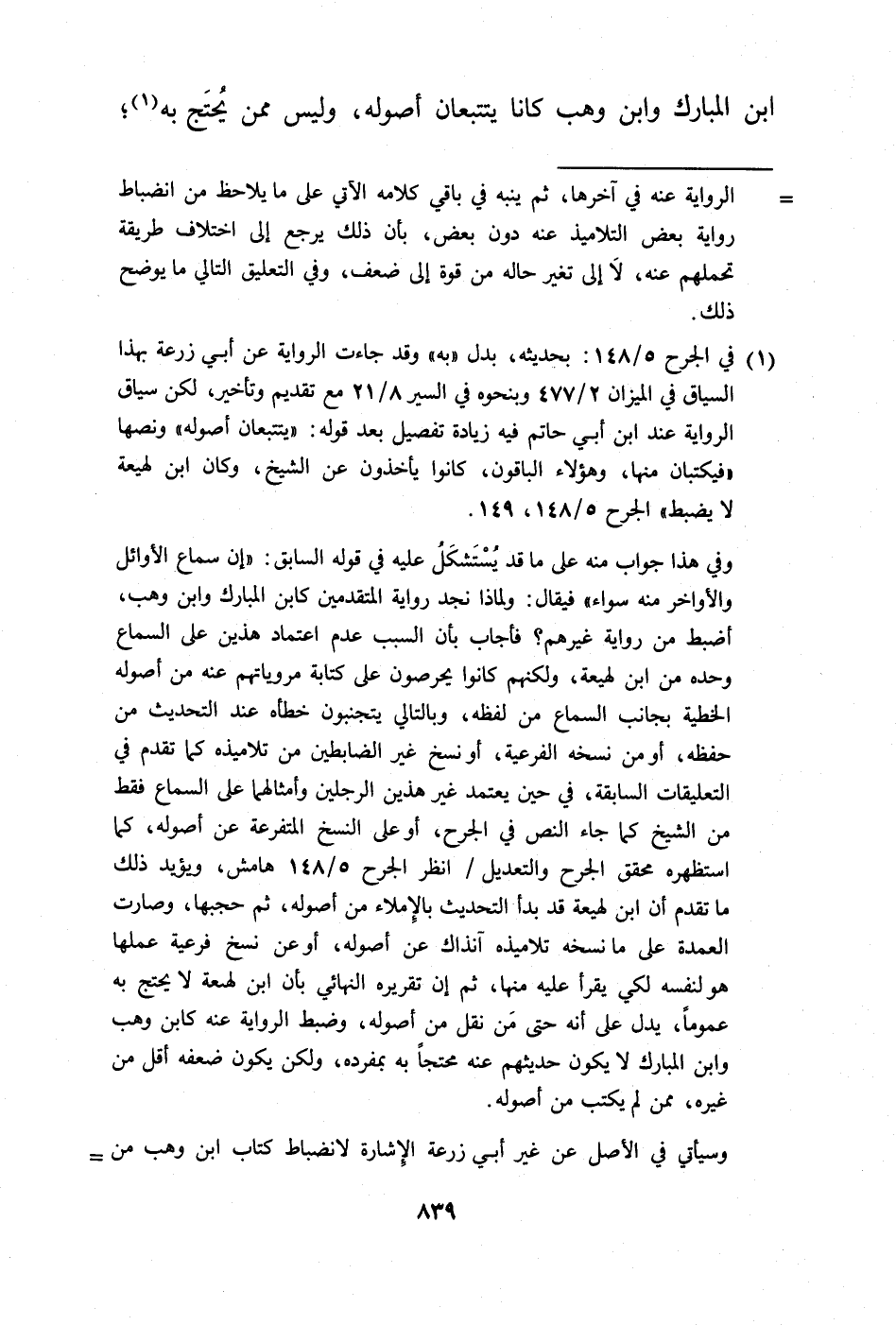 وفي هذا جواب منه على ما قد يُسْتَشكَلُ عليه في قوله السابق: "إن سماع الأوائل والأواخر منه سواء" فيقال: ولماذا نجد رواية المتقدمين كابن المبارك وابن وهب، أضبط من رواية غيرهم؛ فأجاب بأن السبب عدم اعتماد هذين على السماع وحده من ابن لهيعة، ولكنهم كانوا يحرصون على كتابة مروياتهم عنه من أصوله الخطية بجانب السماع من لفظه، وبالتالي يتجنبون خطأه عند التحديث من حفظه، أو من نسخه الفرعية، أو نسخ غير الضابطين من تلاميذه كما تقدم في التعليقات السابقة، في حين يعتمد غير هذين الرجلين وأمثالها على السماع فقط من الشيخ كما جاء النص في الجرح، أو على النسخ المتفرعة عن أصوله، كما استظهره محقق الجرح والتعديل/ انظر الجرح 5/ 148 هامش، ويؤيد ذلك ما تقدم أن ابن لهيعة قد بدأ التحديث بالإملاء من أصوله، ثم حجبها، وصارت العمدة على ما نسخه تلاميذه آنذاك عن أصوله، أو عن نسخ فرعية عملها هو لنفسه لكي يقرأ عليه منها، ثم إن تقريره النهائي بأن ابن لهيعة لا يحتج به عمومًا، يدل على أنه حتى مَن نقل من أصوله، وضبط الرواية عنه كابن وهب وابن المبارك لا يكون حديثهم عنه محتجًا به بمفرده، ولكن يكون ضعفه أقل من غيره، ممن لم يكتب من أصوله.