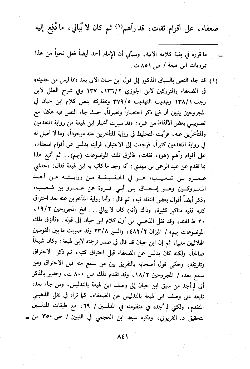 = ما قرره في بقية كلامه الآتية، وسيأتي أن الإمام أحمد أيضًا فعل نحوًا من هذا بمرويات ابن لهيعة/ ص 851 ت.