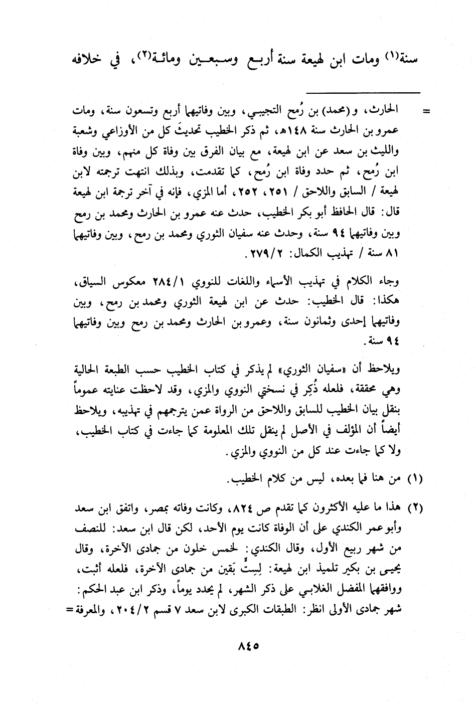 وجاء الكلام في تهذيب الأسماء واللغات للنووي 1/ 284 معكوس السياق، هكذا: قال الخطيب: حدث عن ابن لهيعة الثوري ومحمد بن رمح، وبين وفاتيهما إحدى وثمانون سنة، وعمرو بن الحارث ومحمد بن رمح وبين وفاتيهما 94 سنة.