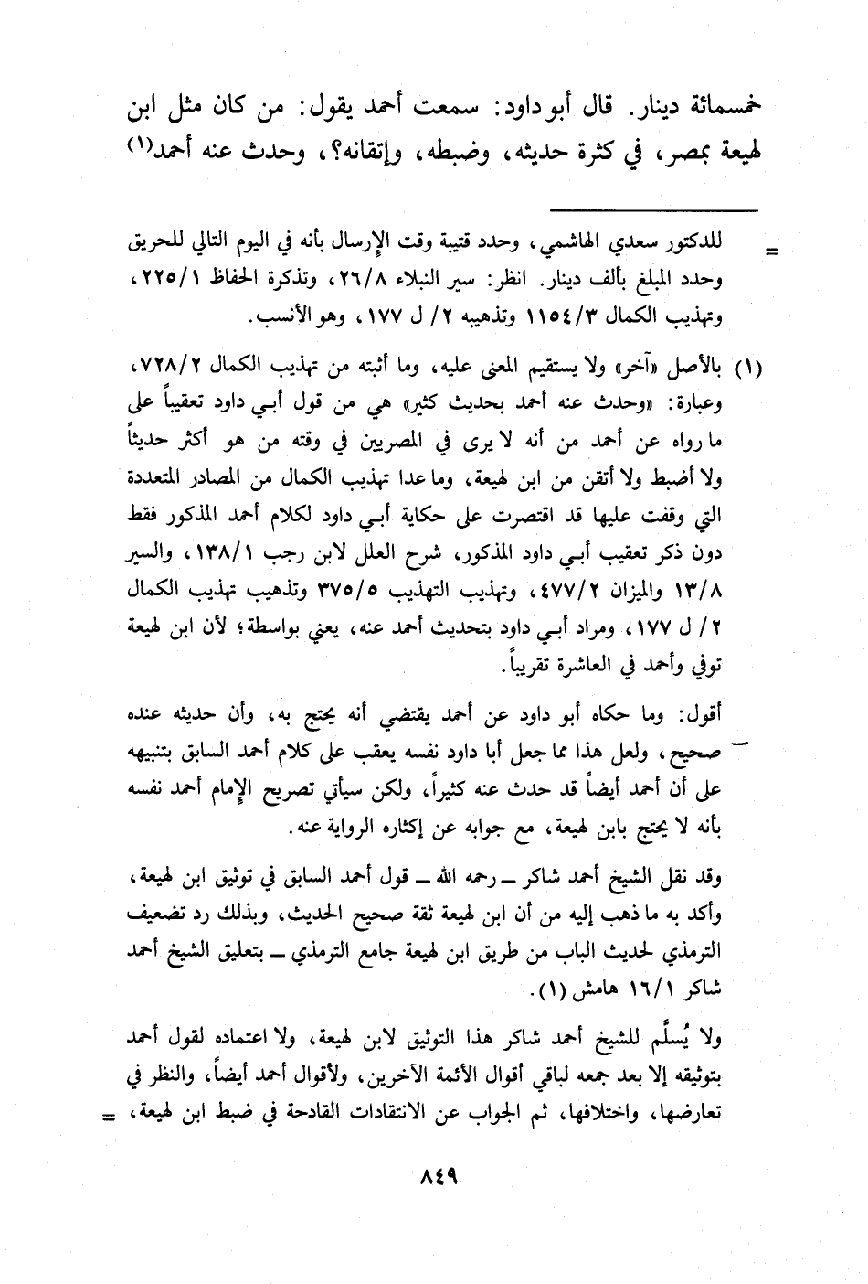 (¬1) بالأصل "آخر" ولا يستقيم المعنى عليه، وما أثبته من تهذيب الكمال 2/ 728، وعبارة: "وحدث عنه أحمد بحديث كثيرا هي من قول أبي داود تعقيبًا على ما رواه عن أحمد من أنه لا يرى في المصريين في وقته من هو أكثر حديثًا ولا أضبط ولا أتقن من ابن لهيعة، وما عدا تهذيب الكمال من المصادر المتعددة التي وقفت عليها قد اقتصرت على حكاية أبي داود لكلام أحمد المذكور فقط دون ذكر تعقيب أبي داود المذكور، شرح العلل لابن رجب 1/ 138، والسير 3/ 18 والميزان 2/ 477، وتهذيب التهذيب 5/ 375 وتذهيب تهذيب الكمال 2 / ل 177، ومراد أبي داود بتحديث أحمد عنه، يعني بواسطة؛ لأن ابن لهيعة توفي وأحمد في العاشرة تقريبًا.