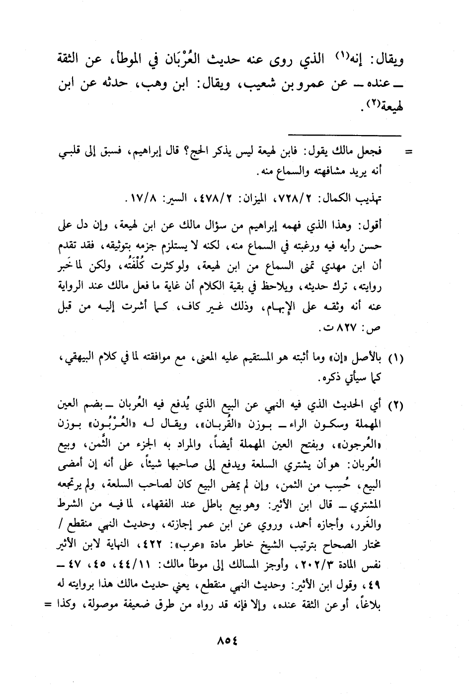 أقول: وهذا الذي فهمه إبراهيم من سؤال مالك عن ابن لهيعة، وإن دل على حسن رأيه فيه ورغبته في السماع منه، لكنه لا يستلزم جزمه بتوثيقه، فقد تقدم أن ابن مهدي تمنى السماع من ابن لهيعة، ولو كثرت كُلْفَتُه، ولكن لما خَبر روايته، ترك حديثه، ويلاحظ في بقية الكلام أن غاية ما فعل مالك عند الرواية عنه أنه وثقه على الإِبهام، وذلك غير كاف، كما أشرت إليه من قبل ص: 827 ت.