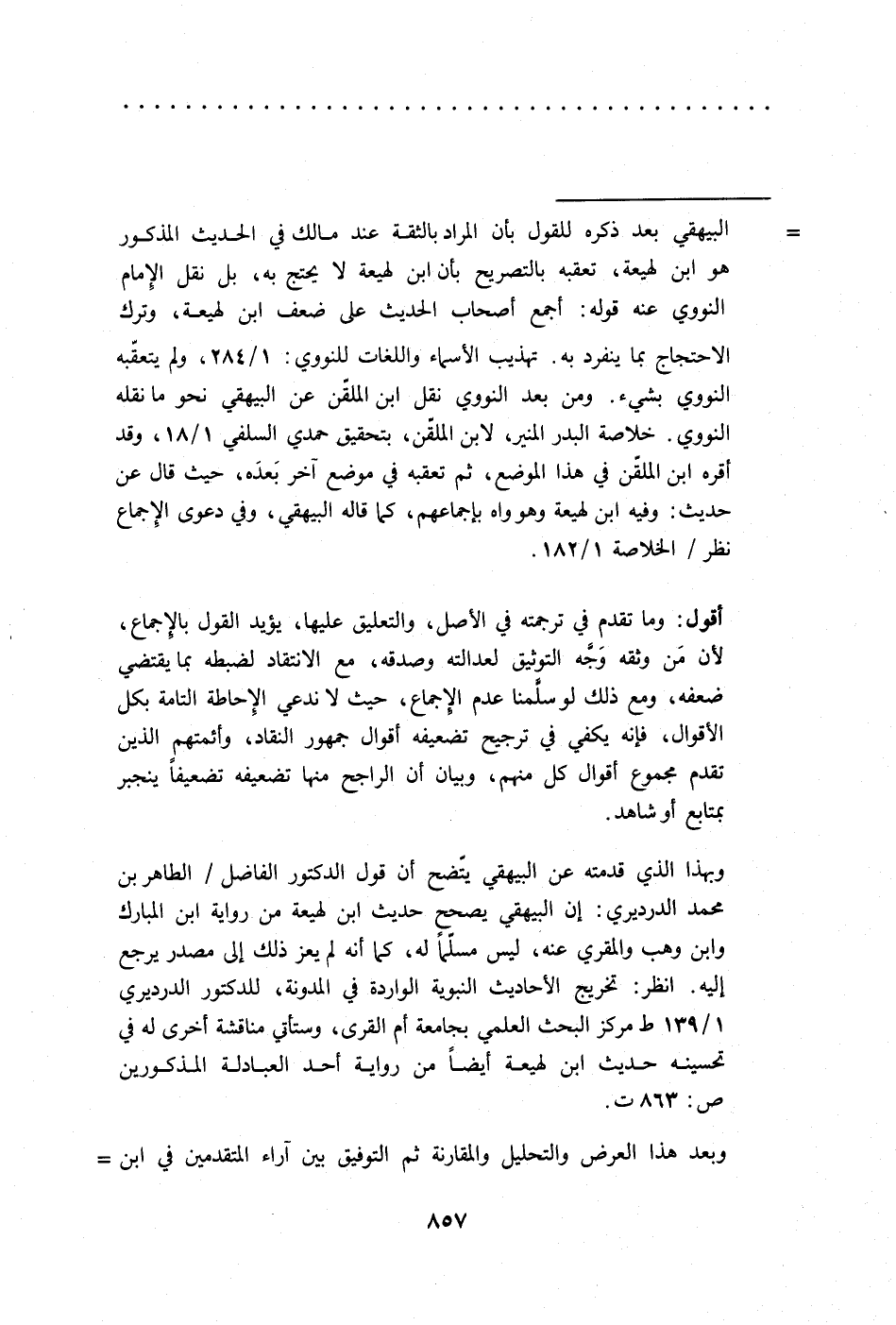 وبهذا الذي قدمته عن البيهقي يتّضح أن قول الدكتور الفاضل/ الطاهر بن محمد الدرديري: إن البيهقي يصحح حديث ابن لهيعة من رواية ابن المبارك وابن وهب والمقري عنه، ليس مسلّمًا له، كما أنه لم يعز ذلك إلى مصدر يرجع اليه. انظر: تخريج الأحاديث النبوية الواردة في المدونة، للدكتور الدرديري 1/ 139 ط مركز البحث العلمي بجامعة أم القرى، وستأتي مناقشة أخرى له في تحسينه حديث ابن لهيعة أيضًا من رواية أحد العبادلة المذكورين ص: 863 ت.