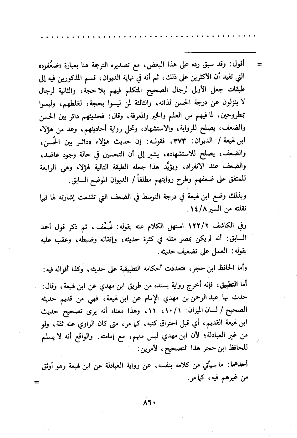 = أقول: وقد سبق رده على هذا البعض، مع تصديره الترجمة هنا بعبارة "ضعَّفوه" التي تفيد أن الأكثرين على ذلك، ثم أنه في نهاية الديوان، قسم المذكورين فيه إلى طبقات جعل الأولى لرجال الصحيح المتكلم فيهم بلا حجة، والثانية لرجال لا ينزلون عن درجة الحسن لذاته، والثالثة لمن ليسوا بحجة، لغلطهم، وليسوا بمطروحين، لما فيهم من العلم والخير والمعرفة، وقال: فحديثهم دائر بين الحسن والضعف، يصلح للرواية، والاستشهاد، وتحل رواية أحاديثهم، وعد من هؤلاء ابن لهيعة/ الديوان: 373، فقوله: إن حديث هؤلاء "دائر بين الحُسن، والضعف، يصلح للاستشهاد"، يشير إلى أن التحسين في حالة وجود عاضد، والضعف عند الانفراد، ويؤيَّد هذا جعله الطبقة التالية لهؤلاء وهي الرابعة للمتفق على ضعفهم وطرح روايتهم مطلقًا/ الديوان الموضع السابق.