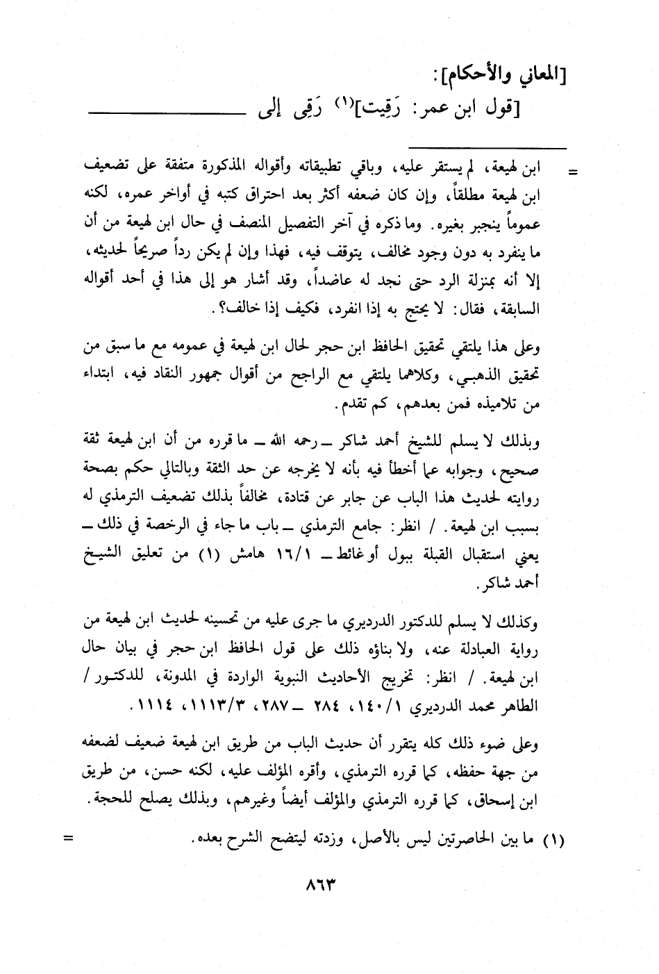 = ابن لهيعة، لم يستقر عليه، وباقي تطبيقاته وأقواله المذكورة متفقة على تضعيف ابن لهيعة مطلقًا، وإن كان ضعفه أكثر بعد احتراق كتبه في أواخر عمره، لكنه عمومًا ينجبر بغيره. وما ذكره في آخر التفصيل المنصف في حال ابن لهيعة من أن ما ينفرد به دون وجود مخالف، يتوقف فيه، فهذا وإن لم يكن ردًا صريحًا لحديثه، إلا أنه بمنزلة الرد حتى نجد له عاضدًا، وقد أشار هو إلى هذا في أحد أقواله السابقة، فقال: لا يحتج به إذا انفرد، فكيف إذا خالف؟.