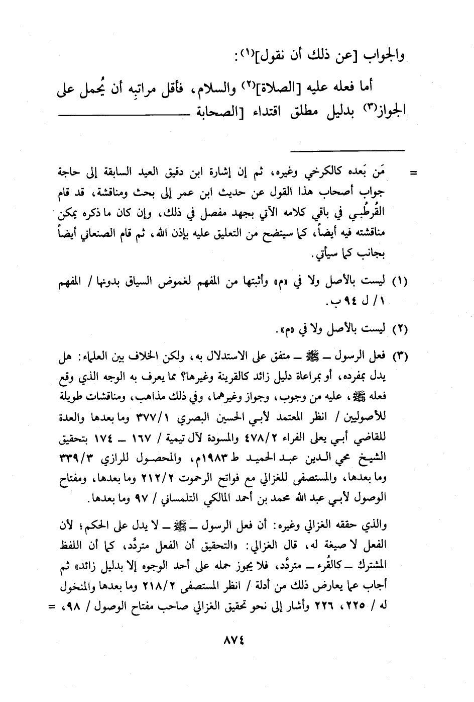 (¬3) فعل الرسول -صلى الله عليه وسلم- متفق على الاستدلال به، ولكن الخلاف بين العلماء: هل يدل بمفرده، أو بمراعاة دليل زائد كالقرينة وغيرها؟ مما يعرف به الوجه الذي وقع فعله -صلى الله عليه وسلم-، عليه من وجوب، وجواز وغيرهما، وفي ذلك مذاهب، ومناقشات طويلة للأصوليين/ انظر المعتمد لأبي الحسين البصري 1/ 377 وما بعدها والعدة للقاضي أبي يعلى الفراء 2/ 478 والمسودة لآل تيمية / 167 - 174 بتحقيق الشيخ محي الدين عبد الحميد ط 1983 م، والمحصول للرازي 3/ 339 وما بعدها، والمستصفى للغزالي مع فواتح الرحموت 2/ 212 وما بعدها، ومفتاح الوصول لأبي عبد الله محمد بن أحمد المالكي التلمساني/ 97 وما بعدها.