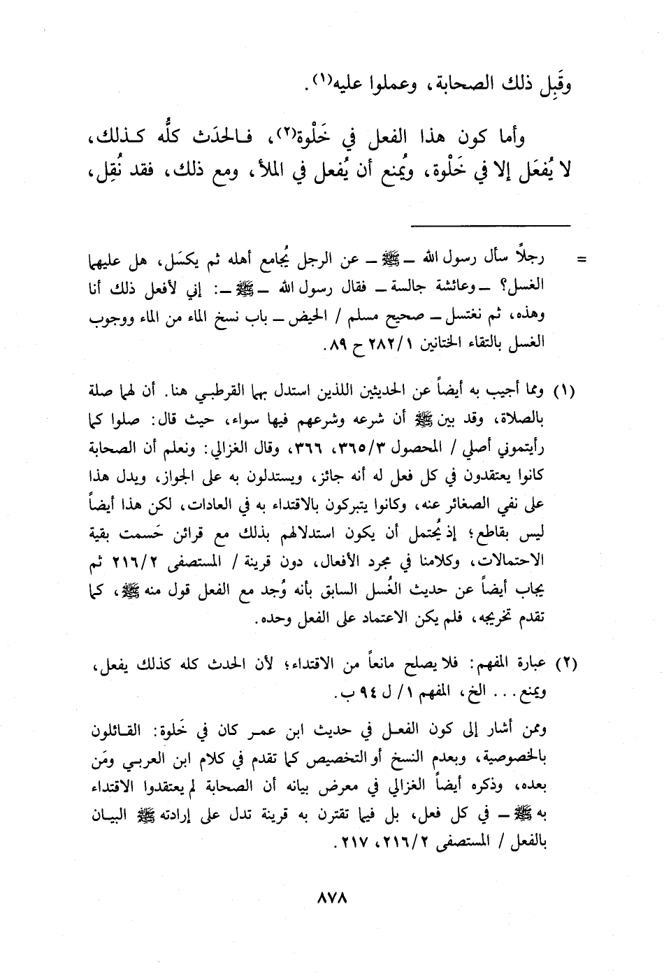(¬1) ومما أجيب به أيضًا عن الحديثين اللذين استدل بهما القرطبي هنا. أن لهما صلة بالصلاة، وقد بين -صلى الله عليه وسلم- أن شرعه وشرعهم فيها سواء، حيث قال: صلوا كما رأيتموني أصلي / المحصول 3/ 365، 366، وقال الغزالي: ونعلم أن الصحابة كانوا يعتقدون في كل فعل له أنه جائز، ويستدلون به على الجواز، ويدل هذا على نفي الصغائر عنه، وكانوا يتبركون بالاقتداء به في العادات، لكن هذا أيضًا ليس بقاطع؛ إذ يُحتمل أن يكون استدلالهم بذلك مع قرائن حَسمت بقية الاحتمالات، وكلامنا في مجرد الأفعال، دون قرينة/ المستصفى 2/ 216 ثم يجاب أيضًا عن حديث الغُسل السابق بأنه وُجد مع الفعل قول منه -صلى الله عليه وسلم-، كما تقدم تخريجه، فلم يكن الاعتماد على الفعل وحده.