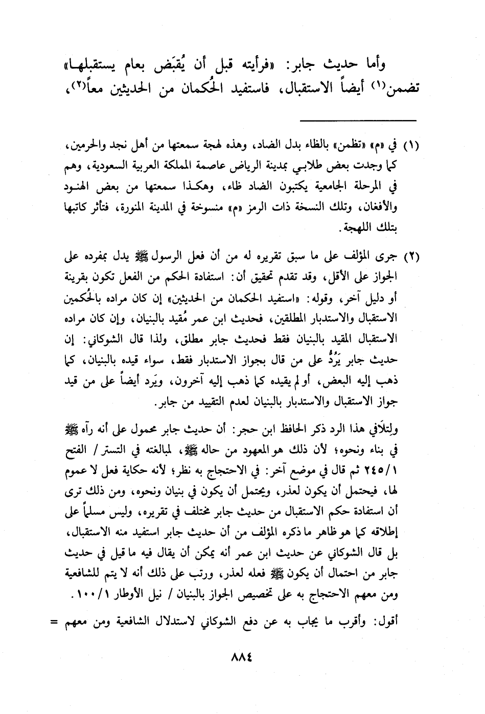 ولِتلَافي هذا الرد ذكر الحافظ ابن حجر: أن حديث جابر محمول على أنه رآه -صلى الله عليه وسلم- في بناء ونحوه؛ لأن ذلك هو المعهود من حاله -صلى الله عليه وسلم-، لمبالغته في التستر/ الفتح 1/ 245 ثم قال في موضع آخر: في الاحتجاج به نظر؛ لأنه حكاية فعل لا عموم لها، فيحتمل أن يكون لعذر، ويحتمل أن يكون في بنيان ونحوه، ومن ذلك ترى أن استفادة حكم الاستقبال من حديث جابر مختلف في تقريره، وليس مسلمًا على إطلاقه كما هو ظاهر ما ذكره المؤلف من أن حديث جابر استفيد منه الاستقبال، بل قال الشوكاني عن حديث ابن عمر أنه يمكن أن يقال فيه ما قيل في حديث جابر من احتمال أن يكون -صلى الله عليه وسلم- فعله لعذر، ورتب على ذلك أنه لا يتم للشافعية ومن معهم الاحتجاج به على تخصيص الجواز بالبنيان/ نيل الأوطار 1/ 100.