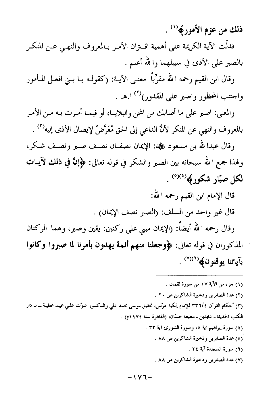 وقال عبد الله بن مسعود رضي الله عنه: الإيمان نصفان نصف صبر ونصف شكر, ولهذا جمع الله سبحانه بين الصبر والشكر في قوله تعالى: {إِنَّ فِي ذَلِكَ لَآياتٍ لِكُلِّ صَبَّارٍ شَكُورٍ} 4 5.