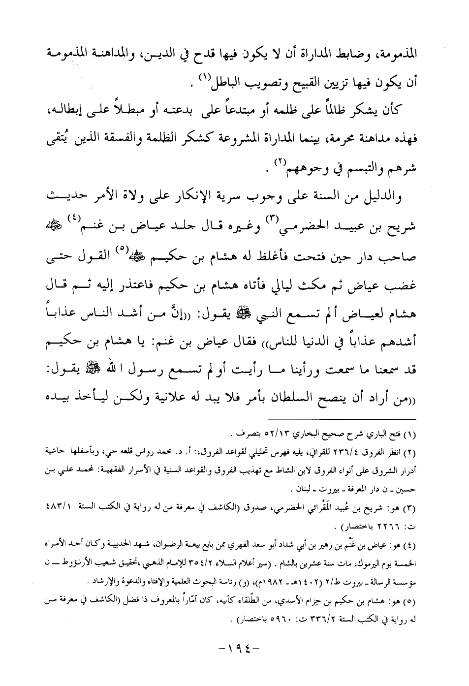 والدليل من السنة على وجوب سرية الإنكار على ولاة الأمر حديث شريح بن عبيد الحضرمي3 وغيره قال جلد عياض بن غنم4 رضي الله عنه صاحب دار حين فتحت فأغلظ له هشام بن حكيم رضي الله عنه5 القول حتى غضب عياض ثم مكث ليالي فأتاه هشام بن حكيم فاعتذر إليه ثم قال هشام لعياض ألم تسمع النبي صلى الله عليه وسلم يقول: " إن من أشد الناس عذابا أشدهم عذابا في الدنيا للناس" فقال عياض بن غنم: يا هشام بن حكيم قد سمعنا ما سمعت ورأينا ما رأيت أو لم تسمع رسول الله صلى الله عليه وسلم يقول: " من أراد أن ينصح السلطان بأمر فلا يبد له علانية ولكن ليأخذ بيده
