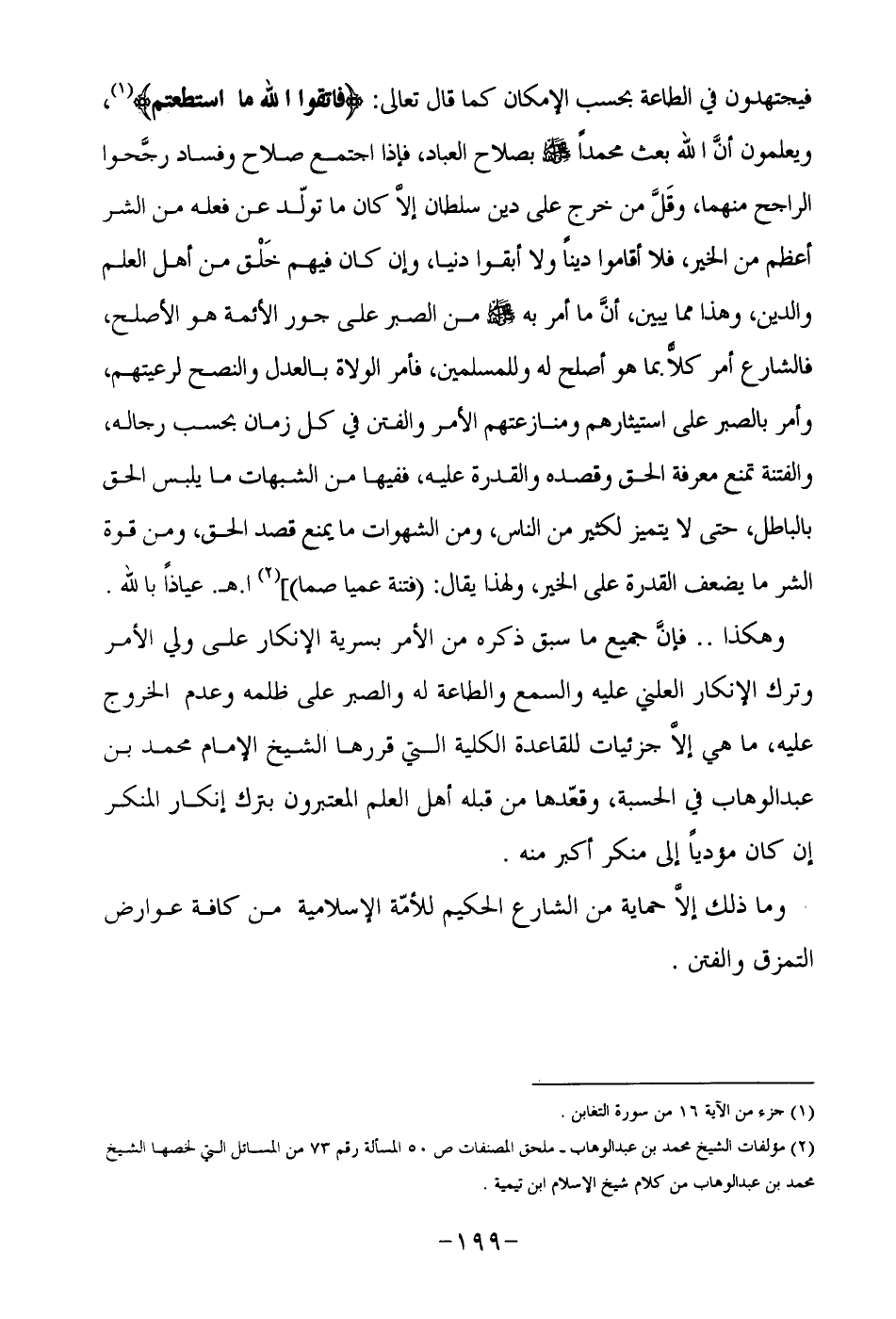 فيجتهدون في الطاعة بحسب الإمكان كما قال تعالى: {فَاتَّقُوا اللَّهَ مَا اسْتَطَعْتُمْ} 1, ويعلمون أن الله بعث محمدا بصلاح العباد, فإذا اجتمع صلاح وفساد رجحوا الراجح منهما, وقل من خرج على دين سلطان إلا كان ما تولد عن فعله من الشر أعظم من الخير, فلا أقاموا دينا ولا أبقوا دنيا, وإنكار فيهم خلق من أهل العلم والدين, وهذا مما يبين , أن ما أمر به صلى الله عليه وسلم من الصبر على جور الأئمة هو الأصلح, فالشارع أمر كلا بما هو أصلح له للمسلمين , فأمر الولاة بالعدل والنصح لرعيتهم, وأمر بالصبر على استيثار ومنازعتهم الأمر والفتن في كل زمان بحسب رجاله, والفتنة تمنع معرفة الحق وقصده والقدرة عليه, ففيها من الشبهات ما يلبس الحق بالباطل, حتى لا يتميز لكثير من الناس, ومن الشهوات ما يمنع قصد الحق, ومن قوة الشر ما يضعف القدرة على الخير, ولهذا يقال: "فتنة عمياء صما"2 اهـ. عياذا بالله.