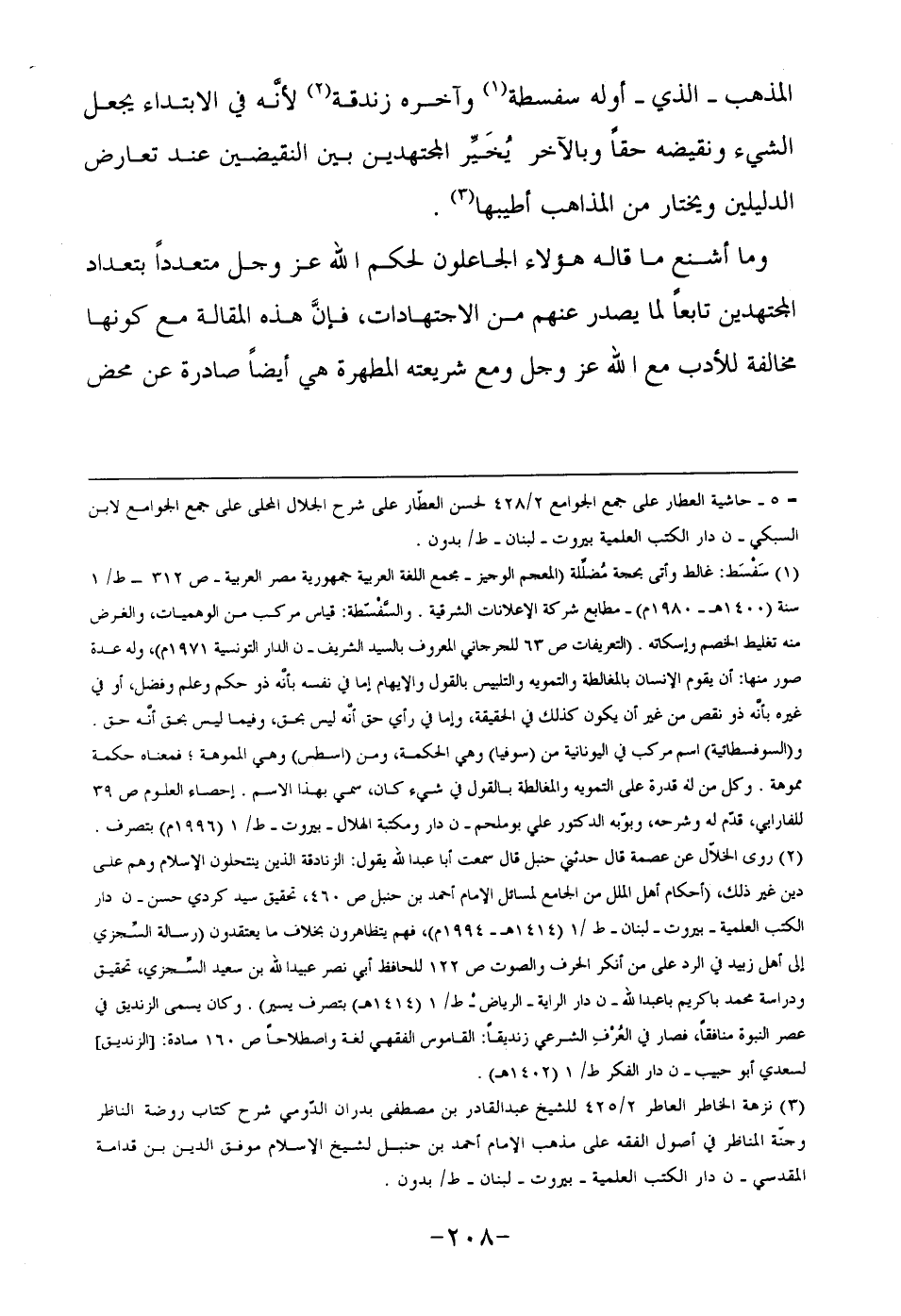 المذهب – الذي – أوله سفسطة1 وآخره زندقة2 لأنه في الابتداء يجعل الشيء ونقيضه حقا وبالآخر يخير المجتهدين بين النقيضين عند تعارض الدليلين ويختار من المذاهب أطيبها3.