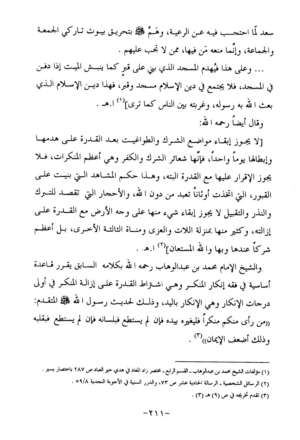 والشيخ الإمام محمد بن عبد الوهاب رحمه الله بكلامه السابق يقرر قاعدة أساسية في فقه إنكار المنكر وهي اشتراط القدرة على إزالة المنكر في أولى درجات الإنكار وهي الإنكار باليد, وذلك لحديث رسول الله صلى الله عليه وسلم المتقدم: "من رأى منكم منكرا فليغيره بيده فإن لم يستطع فبلسانه فإن لم يستطع فبقلبه وذلك أضعف الإيمان" 3.