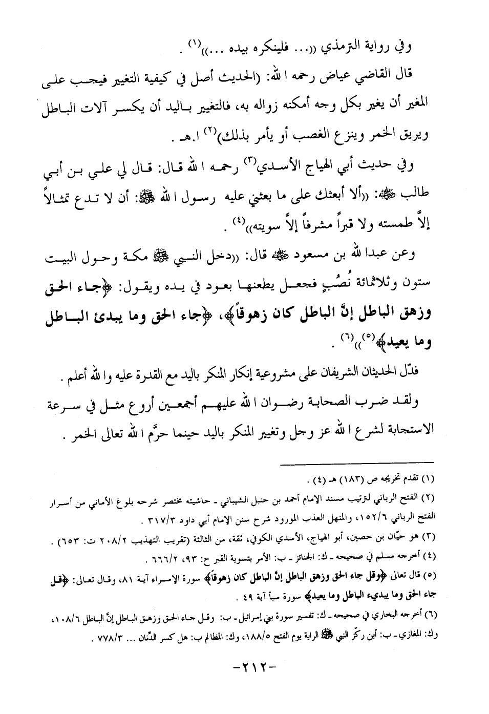 قال القاضي عياض رحمه الله: " الحديث أصل في كيفية التغيير فيجب على المغير أن يغير بكل وجه أمكنه زواله به, فالتغيير باليد أن يكسر آلات الباطل وبريق الخمر وينزع الغصب أو يأمر بذلك"2اهـ.