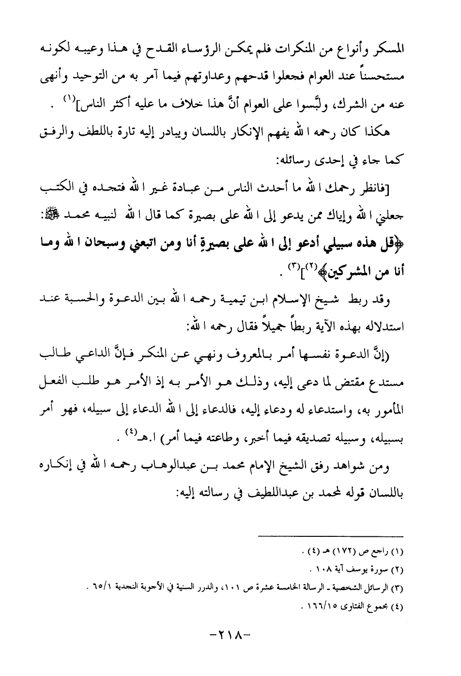 "فانظر رحمك الله ما أحدث الناس من عبادة غير الله فتجده في الكتب جعلني الله وإياك ممن يدعوا إلى الله على بصيرة كما قال الله لنبيه محمد صلى الله عليه وسلم: {قُلْ هَذِهِ سَبِيلِي أَدْعُو إِلَى اللَّهِ عَلَى بَصِيرَةٍ أَنَا وَمَنِ اتَّبَعَنِي وَسُبْحَانَ اللَّهِ وَمَا أَنَا مِنَ الْمُشْرِكِينَ} 2 " 3.