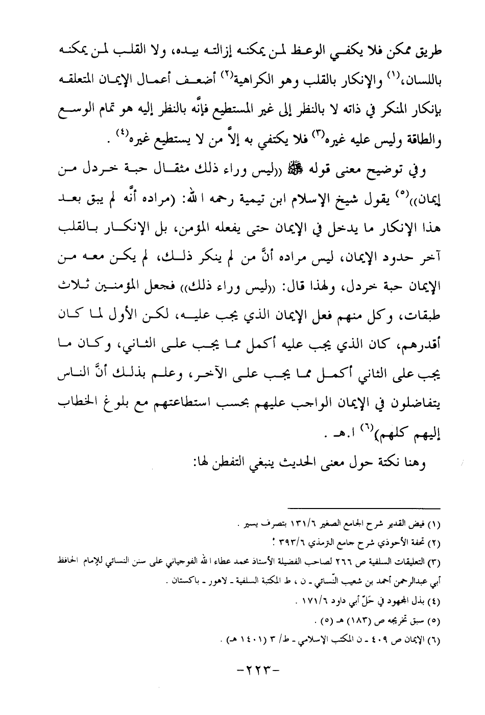 وفي توضيح معنى قوله صلى الله عليه وسلم: "ليس وراء ذلك مثقال حبة خردل من إيمان" 5 يقول شييخ الإسلام ابن تيمية رحمه الله: " مراده أنه لم يبق بعد هذا الإنكار ما يدخل في الإيمان, حتى يفعله المؤمن بل الإنكار بالقلب آخر حدود الإيمان ليس مراده أن من لم ينكر ذلك, لم يكن معه من الإيمان حبة خردل, ولهذا قال: " ليس وراء ذلك" فجعل المؤمنين ثلاث طبقات, وكل منهم فعل الإيمان الذي يجب عليه, لكن الأول لما كان أقدرهم كان الذي يجب عليه أكمل مما يجب على الثاني, وكان ما يجب على الثاني أكمل مما يجب على الآخر, وعلم بذلك أن الناس يتفاضلون في الإيمان الواجب عليهم بحسب استطاعتهم مع بلوغ الخطاب إليهم كلهم"6 اهـ.