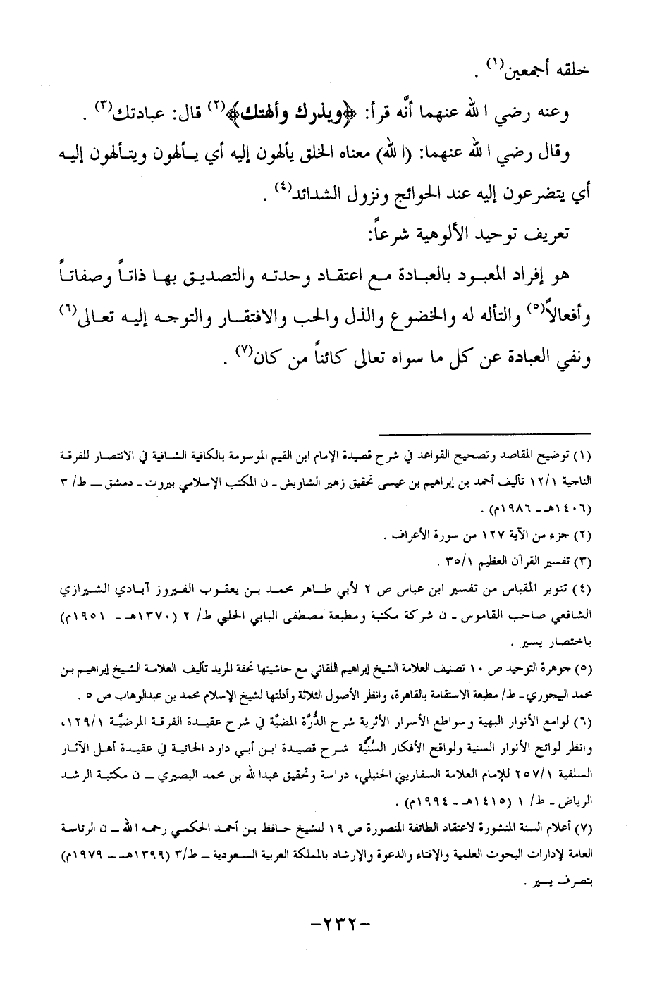 6-لوامع الانوار البهية وسواطع الأسرار الأثرية شرح الدرة المضية في شرح عقيدة الفرقة المرضية1129, وانظر لوائح الأنوار السنية ولواقح الأفكار السنية شرح قصيدة ابن أبي داود الحائية في عقيدة أهل الآثار السلفية 1/257 للإمام العلامة السفاريني الحنبلي, دراسة وتحقيق عبد الله بن محمد البصيري- ن مكتبة الرشد الرياض- ط/1"1415هـ-1994م".