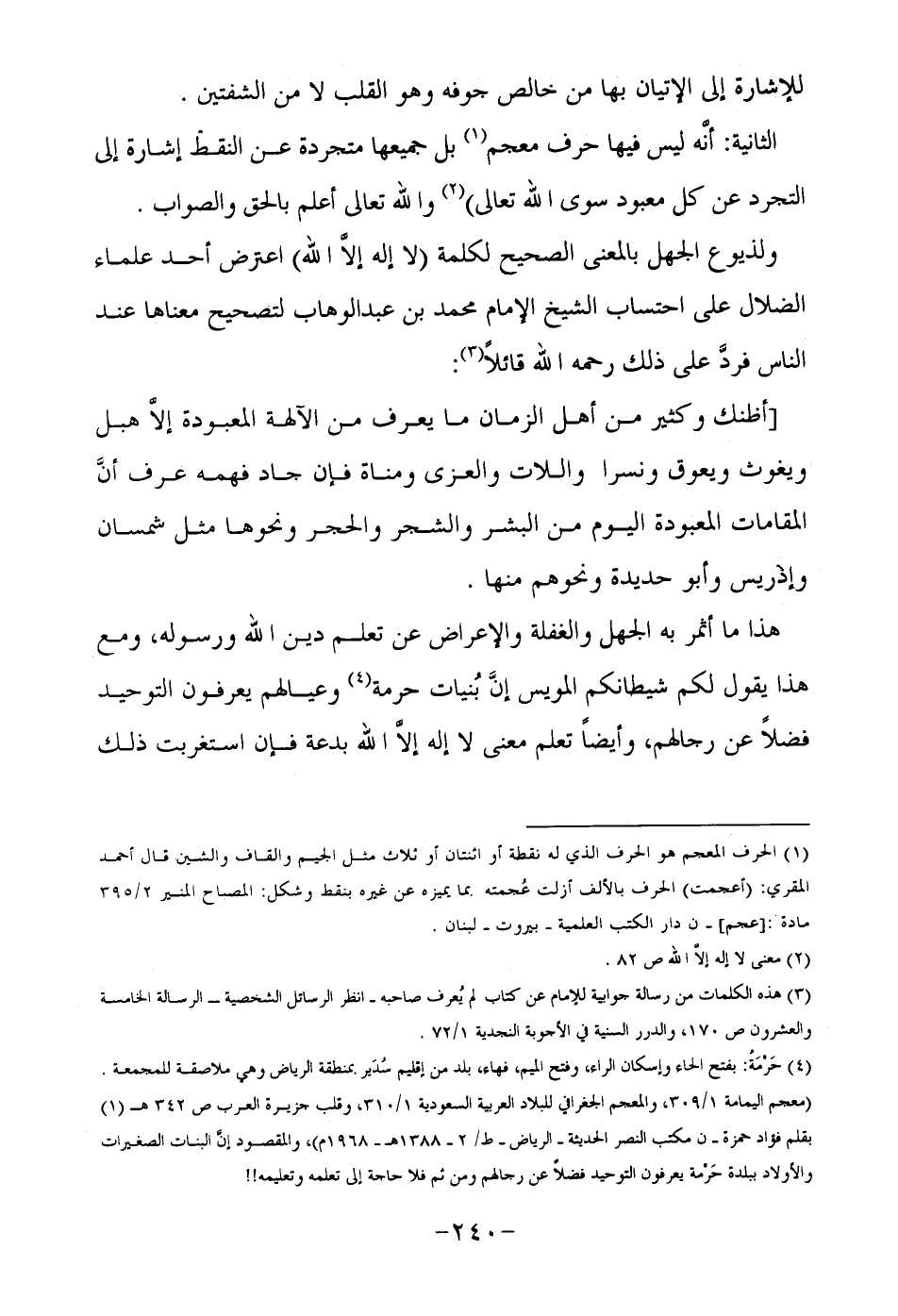 3-هذه الكلمات من رسالة جاوبية للإمام عن كتاب لم يعرف صاحبه- انظر الرسائل الشخصية- الرسالة الخامسة والعشرون ص 170, والدرر السنية في الأجوبة النجدية 1/72.