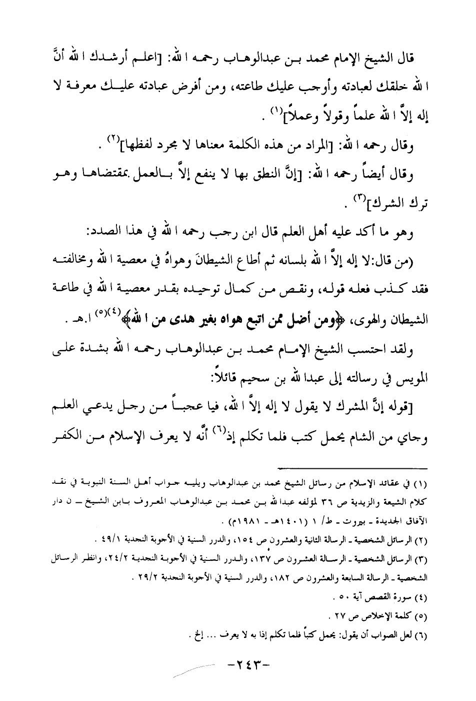 3-الرسائل الشخصية – الرسالة العشرون ص 137, والدرر السنية في الأجوبة النجدية 2/24, وانظر الرسائل الشخصية- الرسالة السابعةو العشرون ص 182, والدرر السنية في الأجوبة النجدية 2/29.