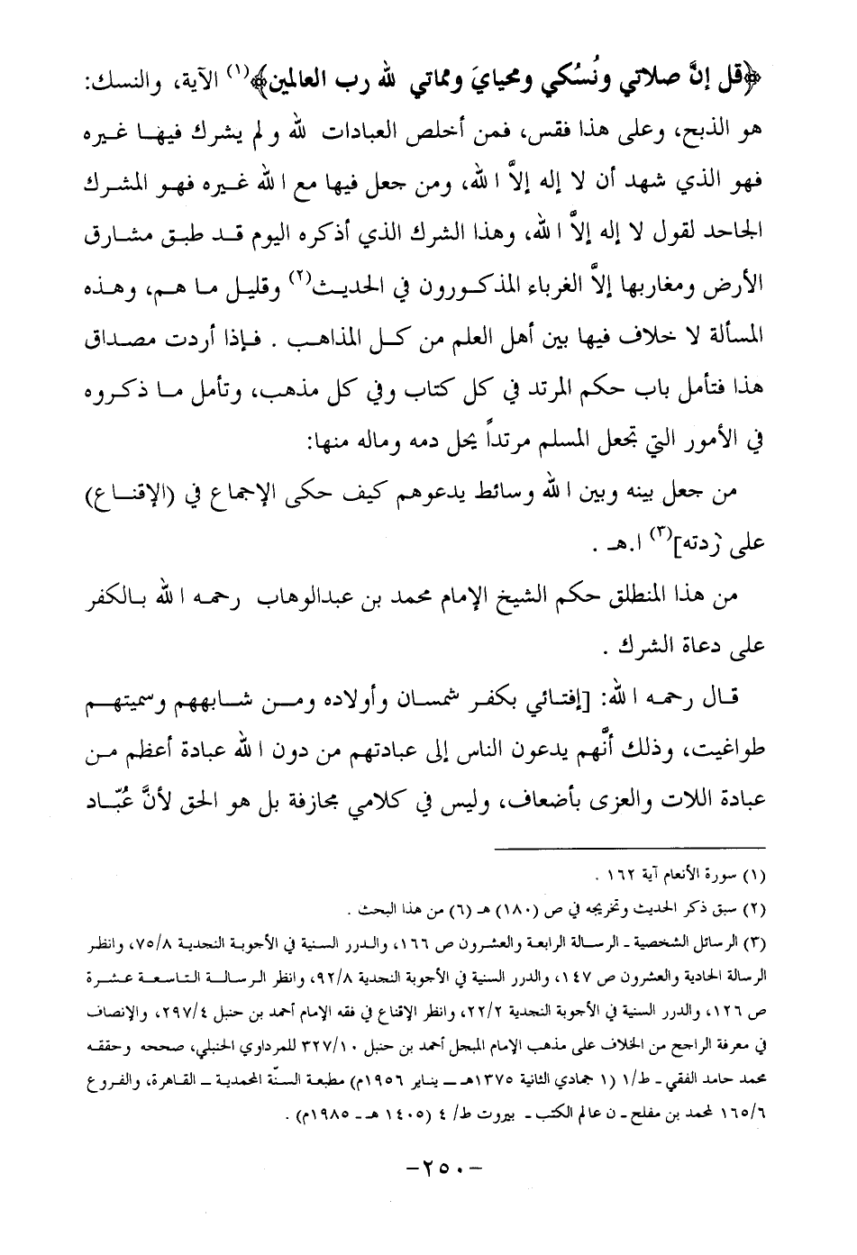 3-الرسائل الشخصية الرسالة والرابعة والعشرون ص 166, والدرر السنية في الأجوبة النجدية 8/75, وانظر الرسالة الحادية والعشرون ص 147, والدرر السنية في الأجوبة النجدية 8/92, وانظر الرسالة التاسعة عشرة ص 126, والدرر السنية في الأجوبة النجدية 2/22, وانظر الإقناع في فقه الإمام أحمد بن حنبل 4/297, والإنصاف في معرفة الراجح من الخلاف على مذهب الإمام المبجل أحمد بن حنبل10/327 للمرداوي الحنبلي, صححه وحققه محمد حامد الفقي- ط/1"1جمادى الثانية 1375هـ- يناير 1956م" مطبعة السنة المحمدية- القاهرة, والفروع 6/165 لمحمد بن مفلح- ن عالم الكتب- بيروت ط/4"1405هـ-1985م".