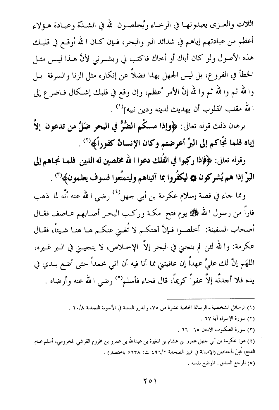 اللات والعزى يعبدونها في الرخاء ويخلصون لله في الشدة وعبادة هؤلاء أعظم من عبادتهم إياهم في شدائد البر والبحر, فإن كان الله أوقع في قلبك هذه الأصول ولو كان أباك أو أخاك فاكتب لي وبشرني لأن هذا ليس مثل الخطأ في الفروع, بل ليس الجهل بهذا فضلا عن إنكاره مثل الزنا والسرقة بل والله ثم والله ثم والله إن الأمر أعظم, وإن وقع في قلبك إشكال فاضرع إلى الله مقلب القلوب أن يهديك لدينه ودين نبيه"1.