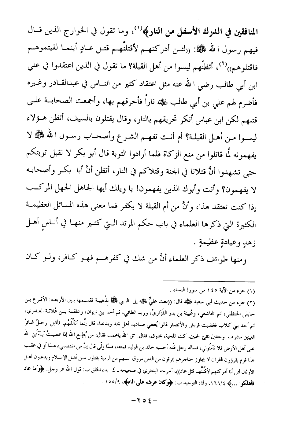 الْمُنَافِقِينَ فِي الدَّرْكِ الْأَسْفَلِ مِنَ النَّارِ} 1, وما تقول في الخوارج الذين قال فيهم رسول الله صلى الله عليه وسلم: " لئن أدركتهم لأقتلنهم قتل عاد أينما لقيتموهم فاقتلوهم" 2, أتظنهم ليسوا من أهل القبلة؟ ما تقول في الذين اعتقدوا في علي ابن أبي طالب رضي الله عنه مثل اعتقاد كثير من الناس في عبد القادر وغيره فأضرم لهم علي بن أبي طالب رضي الله عنه نارا فأحرقهم بها, وأجمعت الصحابة على قتلهم لكن ابن عباس أنكر تحريقهم بالنار, وقال يقتلون بالسيف, أتظن هؤلاء ليسوا من أهل القبلة؟ أم أنت تفهم الشرع وأصحاب رسول الله صلى الله عليه وسلم لا يفهمونه لما قاتلوا من منع الزكاة فلما أرادوا التوبة قال أبو بكر لا نقبل توبتكم حتى تشهدوا أن قتلانا في الجنة وقتلاكم في النار, أتظن أن أبا بكر وأصحابه لا يفهمون؟ وأنت وأبوك الذين يفهمون! يا ويلك أيها الجاهل الجهل المركب إذا كنت تعتقد هذا, وأنَّ من أم القبلة لا يكفر فما معنى هذه المسائل العظيمة الكثيرة التي ذكرها العلماء في باب حكم المرتد التي كثير منها في أناس أهل زهد وعبادة عظيمة.