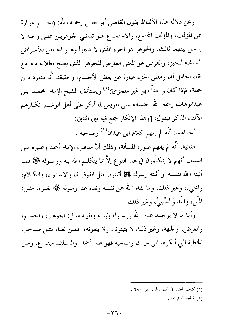 وعن دلالة هذه الألفاظ يقول القاضي أبو يعلى رحمه الله: " الجسم عبارة عن المؤلف, والمؤلف المجتمع, والاجتماع هو تداني الجوهرين على وجه لا يدخل بينهما ثالث, والجوهر هو الجزء الذي لا يتجزأ وهو الحامل للأعراض الشاغلة للحيز, والعرض هو المعنى العارض للجوهر الذي يصح بطلانه منه مع بقاء الحامل له, ومعنى الجزء عبارة عن بعض الأجسام, وحقيقته أنه منفرد من جملة فإذا كان واحدا فهو غير متجزئ"1 ويستأنف الشيخ الإمام محمد ابن عبد الوهاب رحمه الله احتسابه على المويس لما أنكر على أهل الوشم إنكارهم الآنف الذكر فيقول: " وهذا الإنكار جمع فيه بين اثنين: