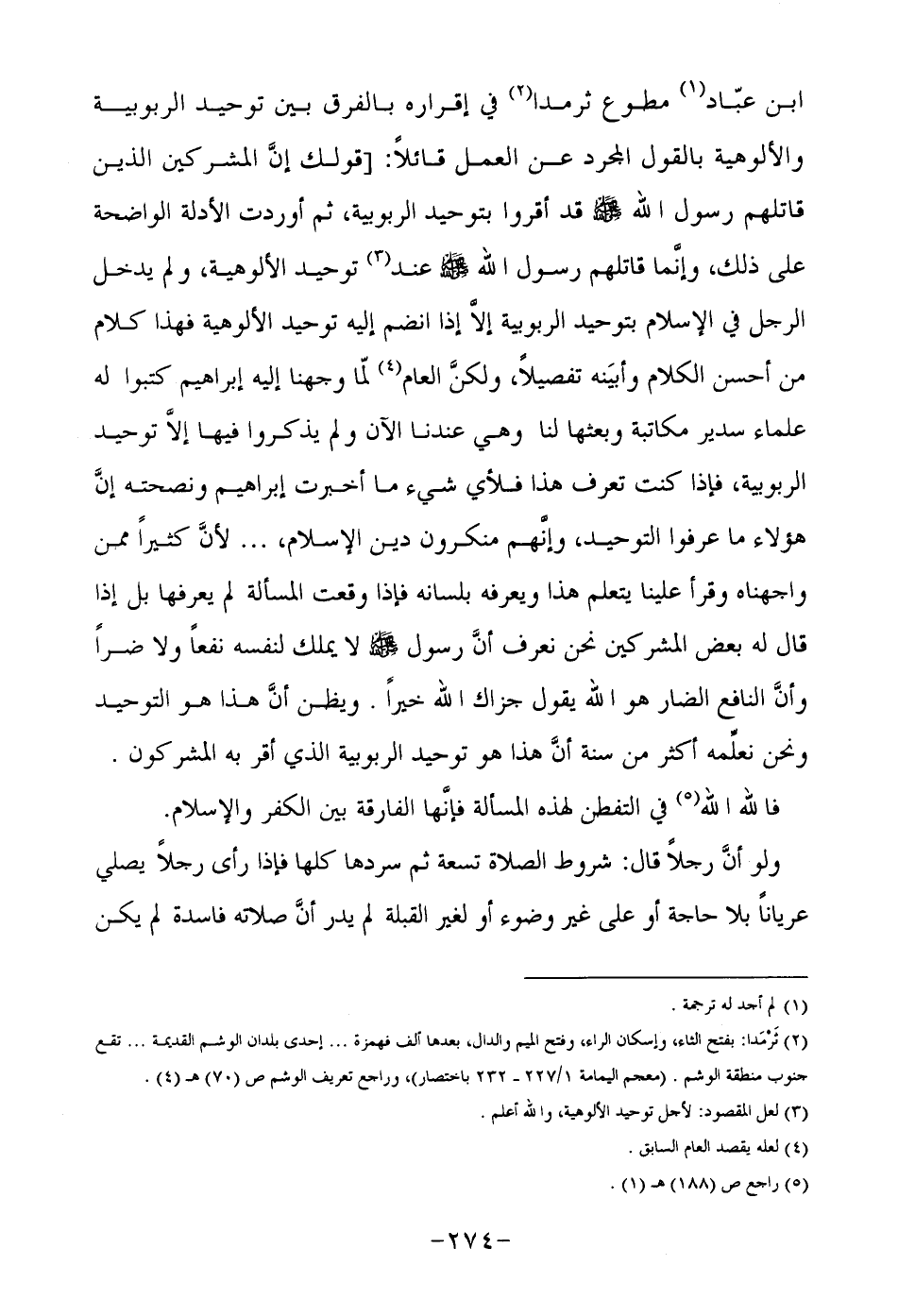ابن عباد1 مطوع ثرمدا2 في إقراره بالفرق بين توحيد الربوبية والألوهية بالقول المجرد عن العمل قائلا: " قولك إن المشركين الذين قاتلهم رسول الله صلى الله عليه وسلم قد أقروا بتوحيد الربوبية, ثم أوردت الأدلة الواضحة على ذلك, وإنما قاتلهم رسول الله صلى الله عليه وسلم عند3 توحيد الألوهية, ولم يدخل الرجل في الإسلام بتوحيد الربوبية إلا انضم إليه توحيد الألوهية فهذا كلام من أحسن الكلام وأبينه تفصيلا, ولكن العام4 لما وجهنا إليه إبراهيم كتبوا له علماء سدير مكاتبة وبعثها لنا هي عندنا الآن ولم يذكروا فيها إلا توحيد الربوبية, فإذا كنت تعرف هذا فلأي شيء ما أخبرت إبراهيم ونصحته إن هؤلاء ما عرفوا التوحيد, وإنهم منكرون دين الإسلام, ... لأن كثيرا ممن واجهناه وقرأ علينا يتعلم هذا ويعرفه بلسانه فإذا وقعت المسألة لم يعرفها بل إذا قال له بعض المشركين نحن نعرف أن رسول الله صلى الله عليه وسلم لا يملك لنفسه نفعا ولا ضرا وأن النافع الضار هو الله يقول جزاك الله خيرا. ويظن أن هذا هو التوحيد ونحن نعلمه أكثر من سنة أن هذا هو توحيد الربوبية الذي أقر به المشركون.