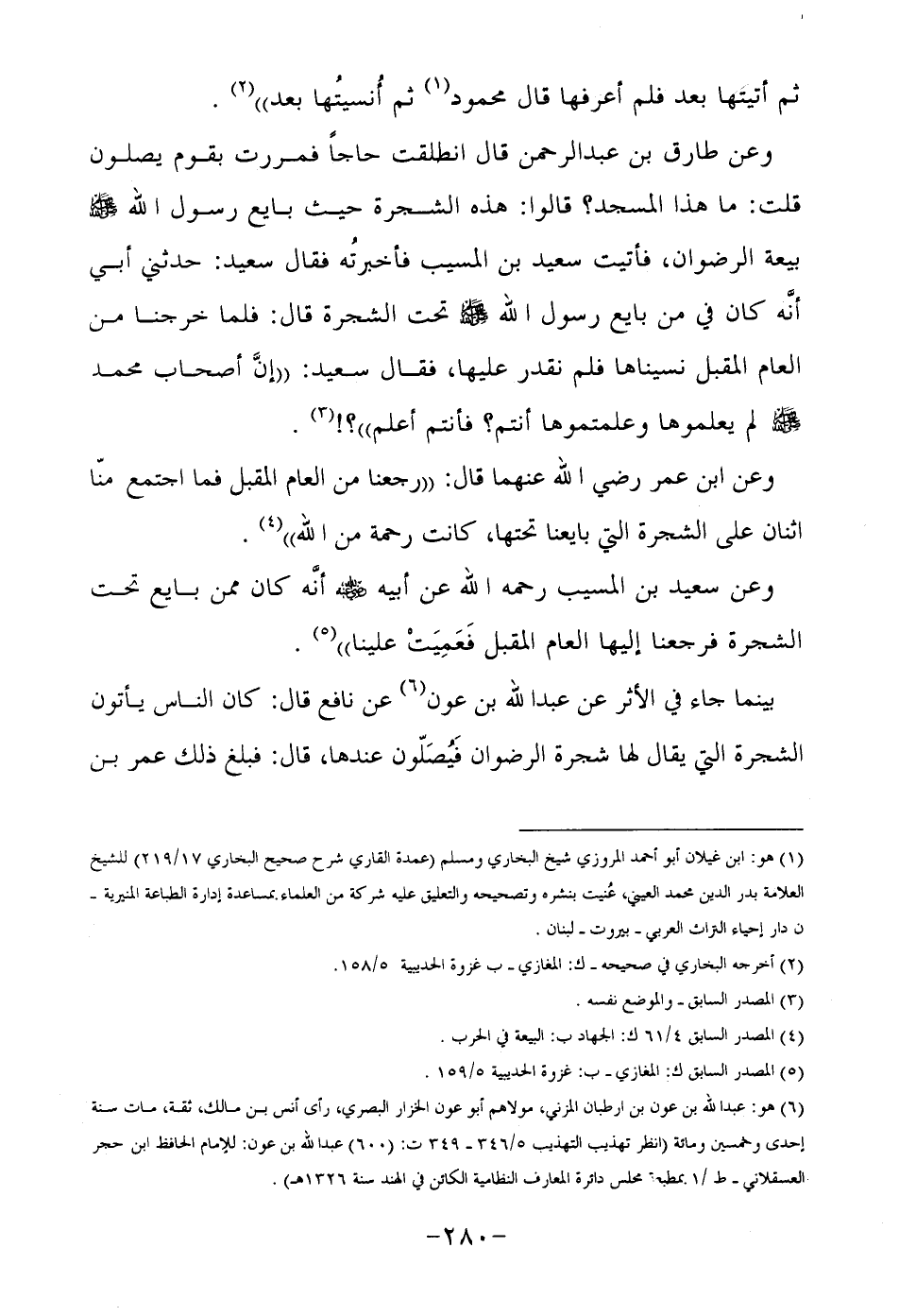 وعن طارق بن عبد الرحمن قال انطلقت حاجا فمررت بقوم يصلون قلت: ما هذا المسجد؟ قالوا: هذه الشجرة حيث بايع رسول الله صلى الله عليه وسلم بيعة الرضوان, فأتيت سعيد بن المسيب فأخبرته فقال سعيد: حدثني أبي أنه كان في من بايع رسول الله صلى الله عليه وسلم تحت الشجرة قال: فلما خرجنا من العام المقبل نسيناها فلم نقدر عليها, فقال سعيد: " إن أصحاب محمد صلى الله عليه وسلم لم يعلموها وعلمتموها انتم؟ فأنتم أعلم"3.