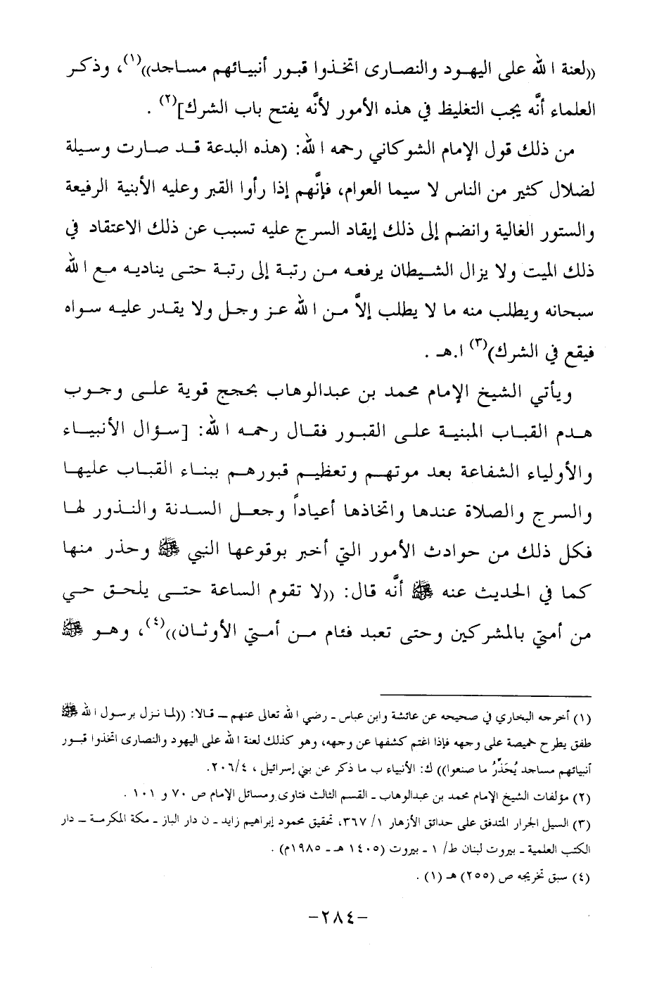 ويأتي الشيخ الإمام محمد بن عبد الوهاب بحجج قوية على وجوب هدم القباب المبنية على القبور فقال رحمه الله: "سؤال الأنبياء والأولياء الشفاعة بعد موتهم وتعظيم قبورهم ببناء القباب عليها والسرج والصلاة عندها واتخاذها أعيادا وجعل السدنة والنذور لها فكل ذلك من حوادث الأمور التي أخبر بوقوعها النبي صلى الله عليه وسلم وحذر منها كما في الحديث عنه صلى الله عليه وسلم أنه قال: " لا تقوم الساعة حتى يلحق حي من أمتي بالمشركين وحتى تعبد فئام من أمتي الأوثان" 4, وهو صلى الله عليه وسلم