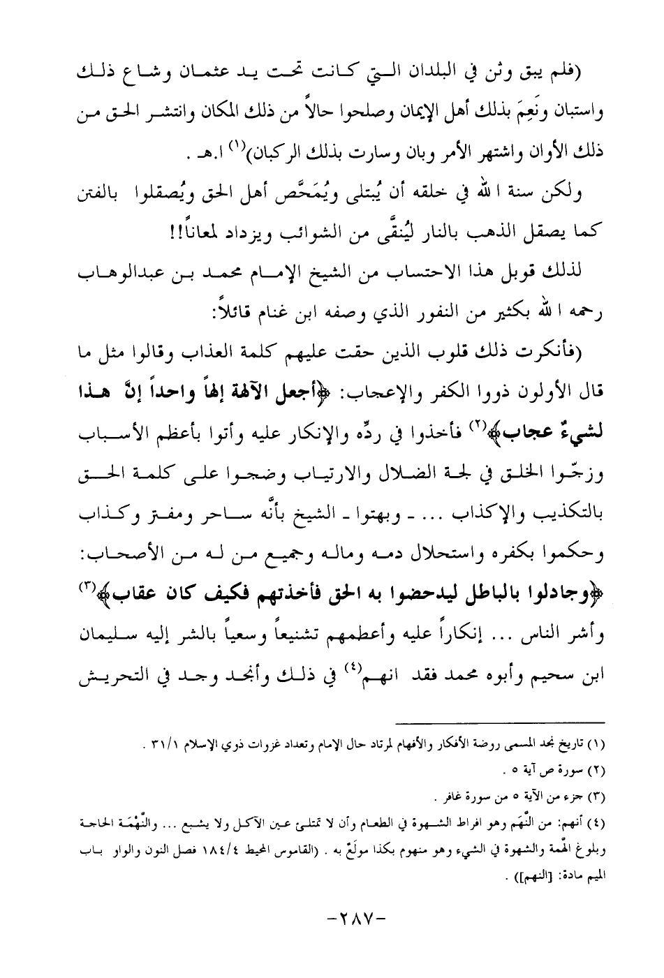 "فأنكرت ذلك قلوب الذين حقت عليهم كلمة العذاب وقالوا مثل ما قال الأولون ذووا الكفر والإعجاب: {أجَعَلَ الْآلِهَةَ إِلَهاً وَاحِداً إِنَّ هَذَا لَشَيْءٌ عُجَابٌ} 2 فأخذوا في رده والإنكار عليه وأتوا بأعظم الأسباب وزجوا الخلق في لجة الضلال والارتياب وضجوا على كلمة الحق بالتكذيب والإكذاب ... – وبهتوا – الشيخ بأنه ساحر ومفتر وكذاب وحكموا بكفره واستحلال دمه وماله وجميع من له من أصحاب: {وَجَادَلُوا بِالْبَاطِلِ لِيُدْحِضُوا بِهِ الْحَقَّ فَأَخَذْتُهُمْ فَكَيْفَ كَانَ عِقَابِ} 3 وأشر الناس ... إنكارا عليه وأعطمهم تشنيعا وسعيا بالشر إليه سليمان ابن سحيم وأبوه محمد فقد أنهم4 في ذلك وأنجد وجد في التحريش