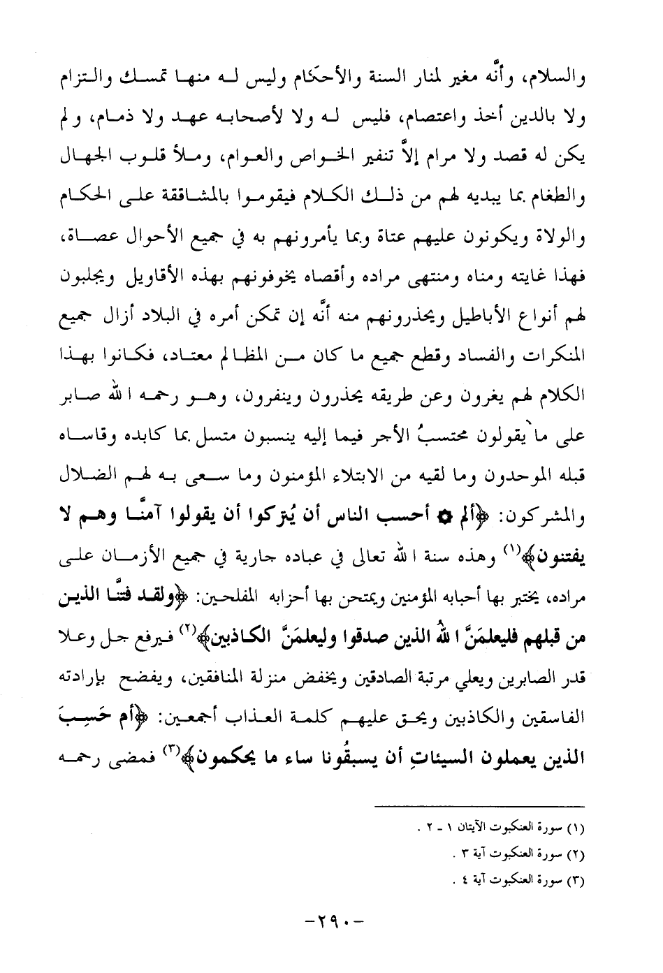 والسلام, وأنه مغير لمنار السنة والأحكام وليس له منها تمسك والتزام ولا بالدين أخذ واعتصام, فليس له ولا لأصحابه عهد ولا ذمام, ولم يكن له قصد ولا مرام إلا تنفير الخواص والعوام, ملأ قلوب الجهال والطغام بما يبديه لهم من ذلك الكلام فيقوموا بالمشاققة على الحكام والولاة ويكونون عليهم عتاة وبما يأمرونهم به في جميع الأحوال عصاة, فهذا غايته ومناه ومنتهى مراده وأقصاه يخوفونهم بهذه الأقاويل ويجلبون لهم أنواع الأباطيل ويحذرونهم منه أنه إن تمكن أمره في البلاد أزال جميع المنكرات والفساد وقطع جميع ما كان من المظالم معتاد, فكانوا بهذا الكلام لهم يغرون وعن طريقه يحذرون وينفرون, وهو رحمه الله صابر على ما يقولون محتسب الأجر فيما إليه ينسبون متسل بما كابده وقاساه قبله الموحدون وما لقيه من الابتلاء المؤمنون وما سعى به لهم الضلال والمشركون: {ألم, أَحَسِبَ النَّاسُ أَنْ يُتْرَكُوا أَنْ يَقُولُوا آمَنَّا وَهُمْ لا يُفْتَنُونَ} 1 وهذه سنة الله تعالى في عبادة جارية في جميع الأزمان على مراده, يختبر بها أحبابه المؤمنين ويمتحن بها أحزابه المفلحين: {وَلَقَدْ فَتَنَّا الَّذِينَ مِنْ قَبْلِهِمْ فَلَيَعْلَمَنَّ اللَّهُ الَّذِينَ صَدَقُوا وَلَيَعْلَمَنَّ الْكَاذِبِينَ} 2 فيرفع جل وعلا قدر الصابرين ويعلى مرتبة الصادقين ويخفض منزلة المنافقين, ويفضح بإرادته الفاسقين والكاذبين ويحق عليهم كلمة العذاب أجمعين: {أَمْ حَسِبَ الَّذِينَ يَعْمَلُونَ السَّيِّئَاتِ أَنْ يَسْبِقُونَا سَاءَ مَا يَحْكُمُونَ} 3 فمضى رحمه