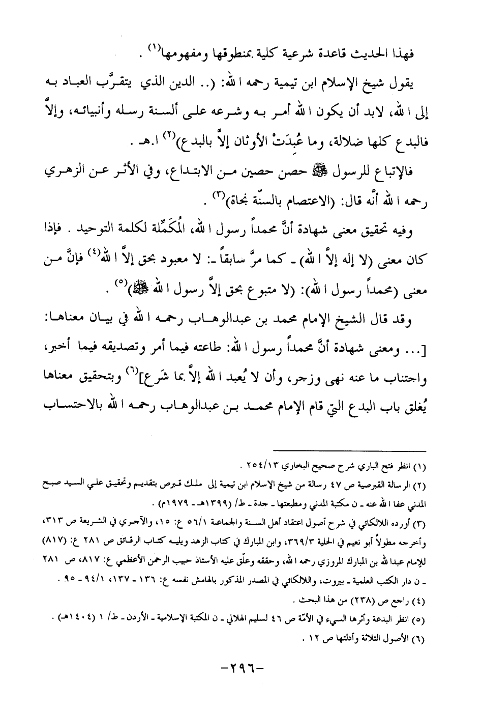 وقد قال الشيخ الإمام محمد بن عبد الوهاب رحمه الله في بيان معناها: " ... ومعنى شهادة أن محمدا رسول الله: طاعته فيما أمر وتصديقه فيما أخبر, واجتناب ما نهى عنه وزجر, وأن لا يعبد الله إلا بما شرع"6 وبتحقيق معناها يغلق باب البدع التي قام الإمام محمد بن عبد الوهاب رحمه الله بالاحتساب