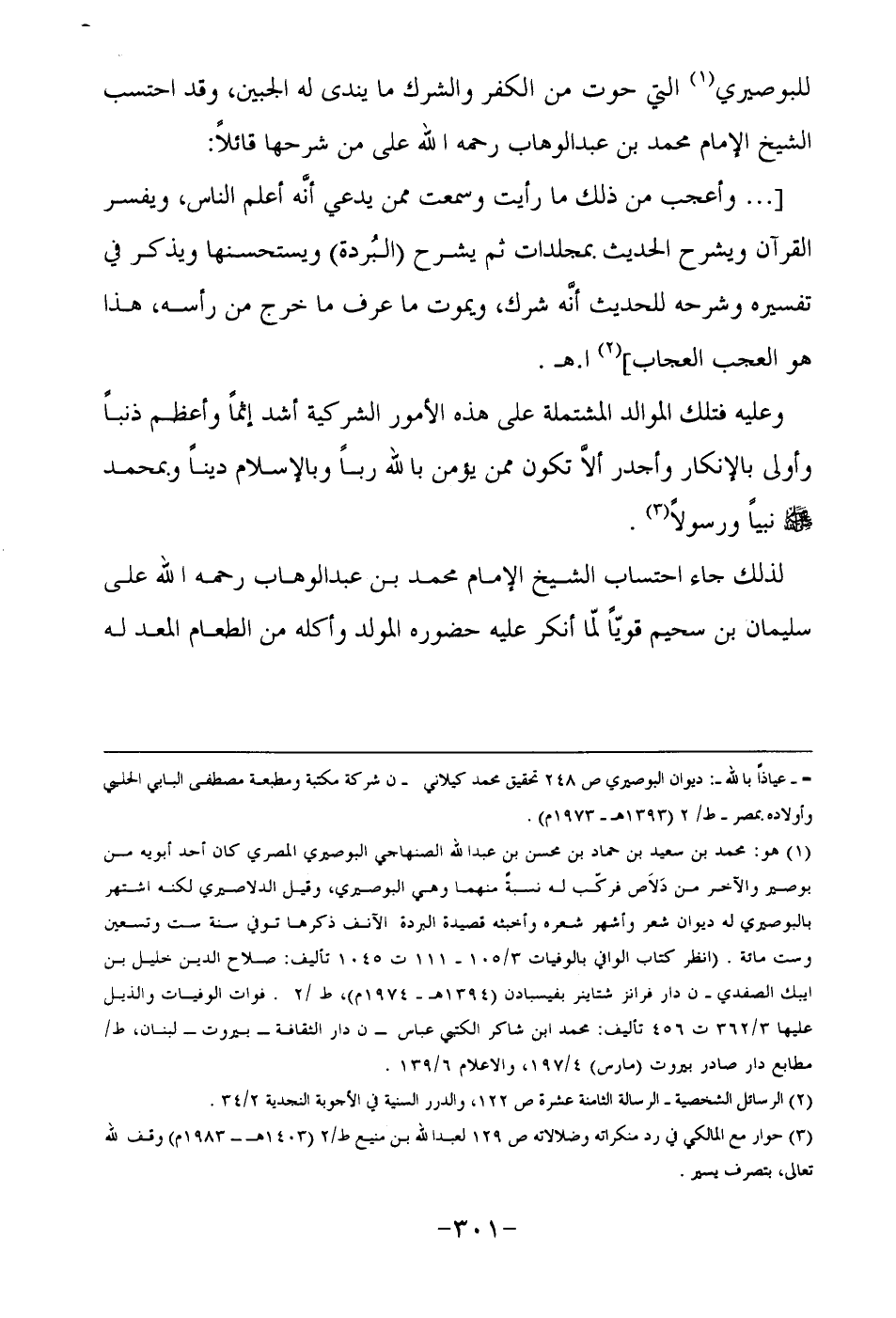 للبوصيري1 التي حوت من الكفر والشرك ما يندى له الجبين, وقد احتسب الشيخ الإمام محمد بن عبد الوهاب رحمه الله على شرحها قائلا: