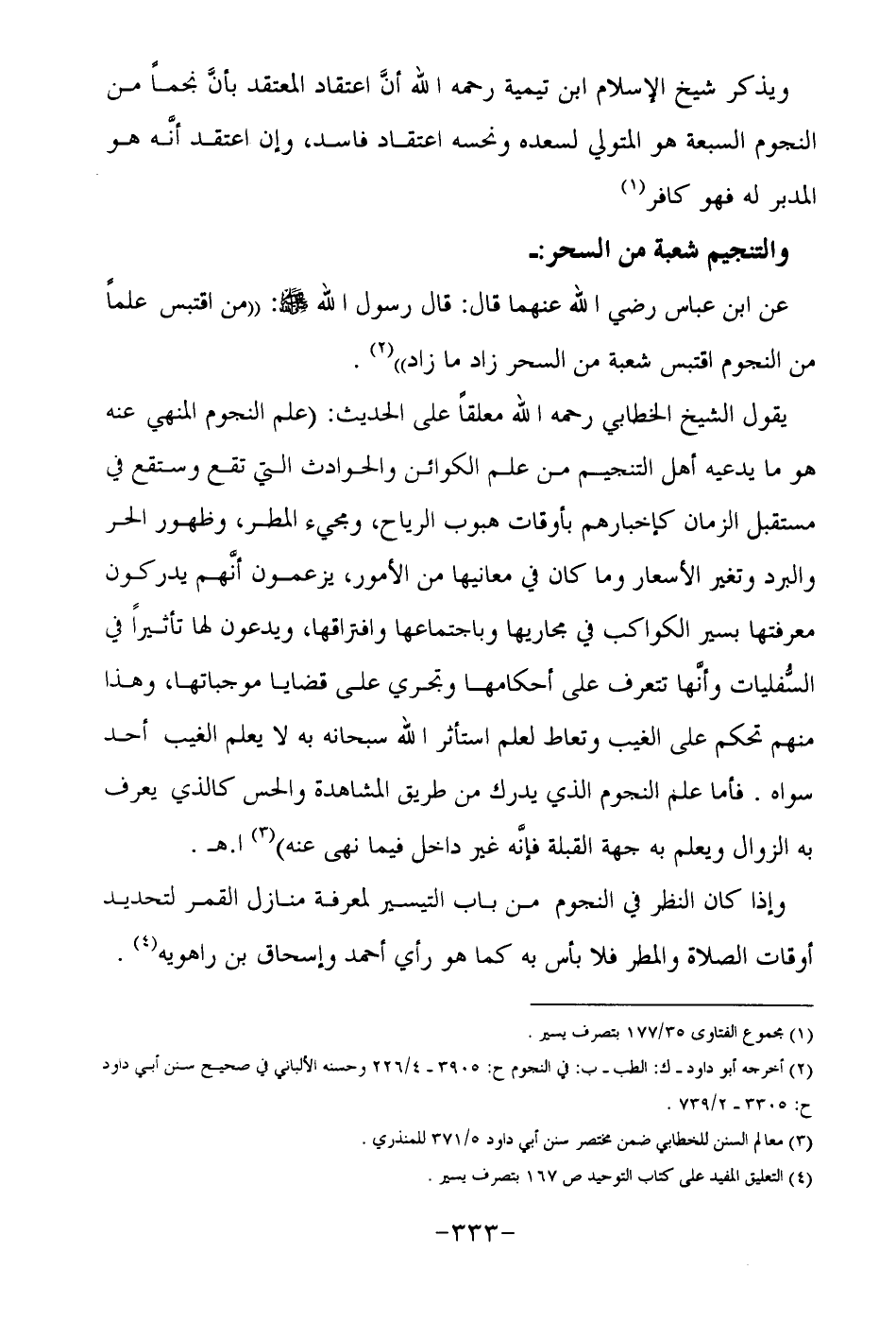 عن ابن عباس رضي الله عنهما قال: قال رسول الله صلى الله عليه وسلم: من اقتبس علما من النجوم اقتبس شعبة من السحر زاد ما زاد" 2.