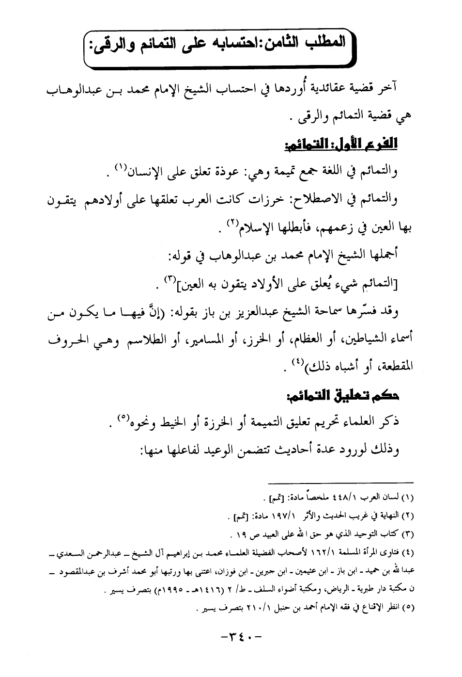 آخر قضية عقائدية أُوردها في احتساب الشيخ الإمام محمد بن عبد الوهاب هي قضية التمائم والرقى.