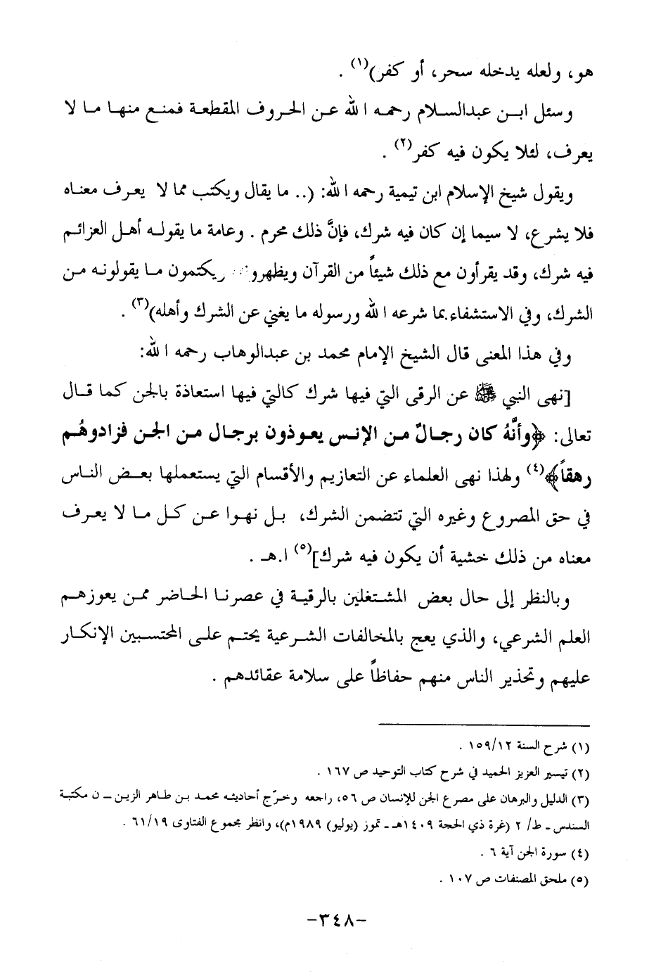 [نهى النبي صلى الله عليه وسلم عن الرقى التي فيها شرك كالتي فيها استعاذة بالجن كما قال تعالى: {وأنَّهُ كان رجالٌ من الإنس يعوذون برجال من الجن فزادوهُم رهقاً} 4 ولهذا نهى العلماء عن التعازيم والأقسام التي يستعملها بعض الناس في حق المصروع وغيره التي تتضمن الشرك، بل نهوا عن كل ما لا يعرف معناه من ذلك خشية أن يكون فيه شرك] 5 ا. هـ.