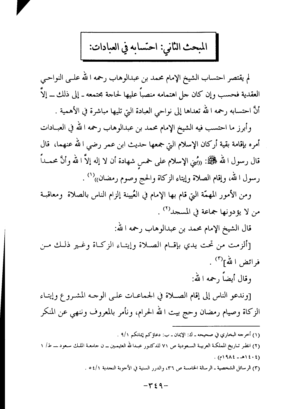 وأبرز ما احتسب فيه الشيخ الإمام محمد بن عبد الوهاب رحمه الله في العبادات أمره بإقامة بقية أركان الإسلام التي جمعها حديث ابن عمر رضي الله عنهما، قال قال رسول الله صلى الله عليه وسلم: "بُني الإسلام على خمسٍ شهادة أن لا إله إلاّ الله وأنَّ محمداً رسول الله، وإقام الصلاة وإيتاء الزكاة والحج وصوم رمضان" 1.