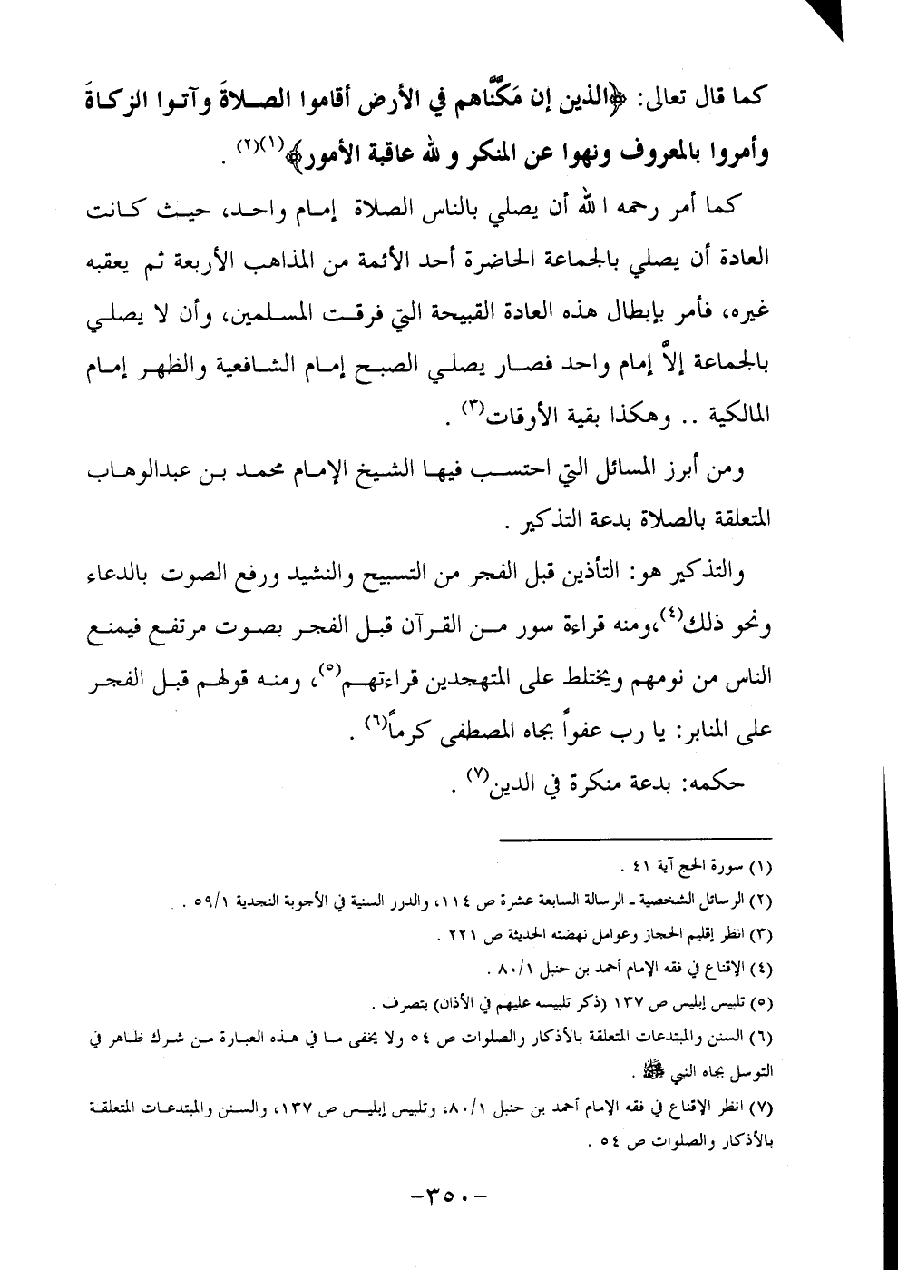 ومن أبرز المسائل التي احتسب فيها الشيخ الإمام محمد بن عبد الوهاب المتعلقة بالصلاة بدعة التذكير.