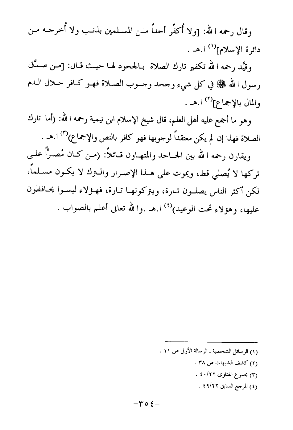 ويقارن رحمه الله بين الجاحد والمتهاون قائلاً: (من كان مُصرِّاً على تركها لا يُصلي قط، ويموت على هذا الإصرار والترك لا يكون مسلماً، لكن أكثر الناس يصلون تارة، ويتركونها تارة، فهؤلاء ليسوا يحافظون عليها، وهؤلاء تحت الوعيد) 4 ا. هـ. والله تعالى أعلم بالصواب.