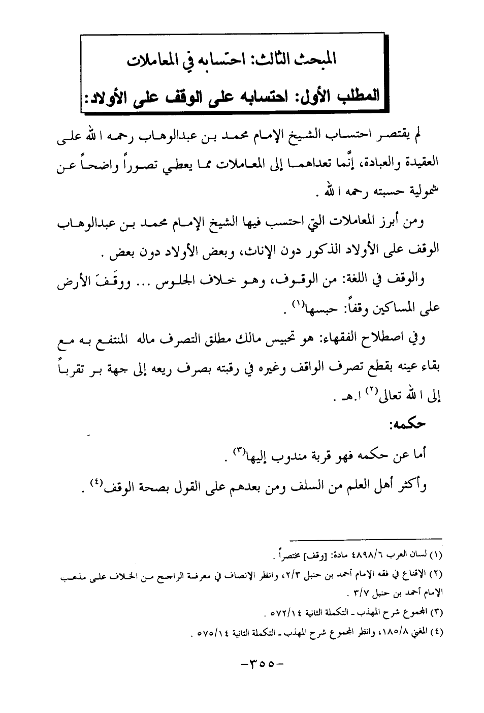 ومن أبرز المعاملات التي احتسب فيها الشيخ الإمام محمد بن عبد الوهاب الوقف على الأولاد الذكور دون الإناث، وبعض الأولاد دون بعض.