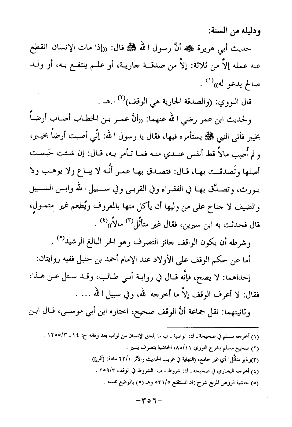 ولحديث ابن عمر رضي الله عنهما: "أنَّ عمر بن الخطاب أصاب أرضاً بخيبر فأتى النبي صلى الله عليه وسلم يستأمره فيها، فقال يا رسول الله: إنّي أصبت أرضاً بخيبر، ولم أُصبِ مالاً قط أنفس عندي منه فما تأمر به، قال: إن شئت حَبست أصلها وتَصدقت بها، قال: فتصدق بها عمر أنَّه لا يباع ولا يوهب ولا يورث، وتصدَّق بها في الفقراء وفي القربى وفي سبيل الله وابن السبيل والضيف لا جناح على من وليها أن يأكل منها بالمعروف ويُطعم غير متمولٍ، قال فحدثت به ابن سيرين، فقال غير متأثَّل3 مالاً" 4.