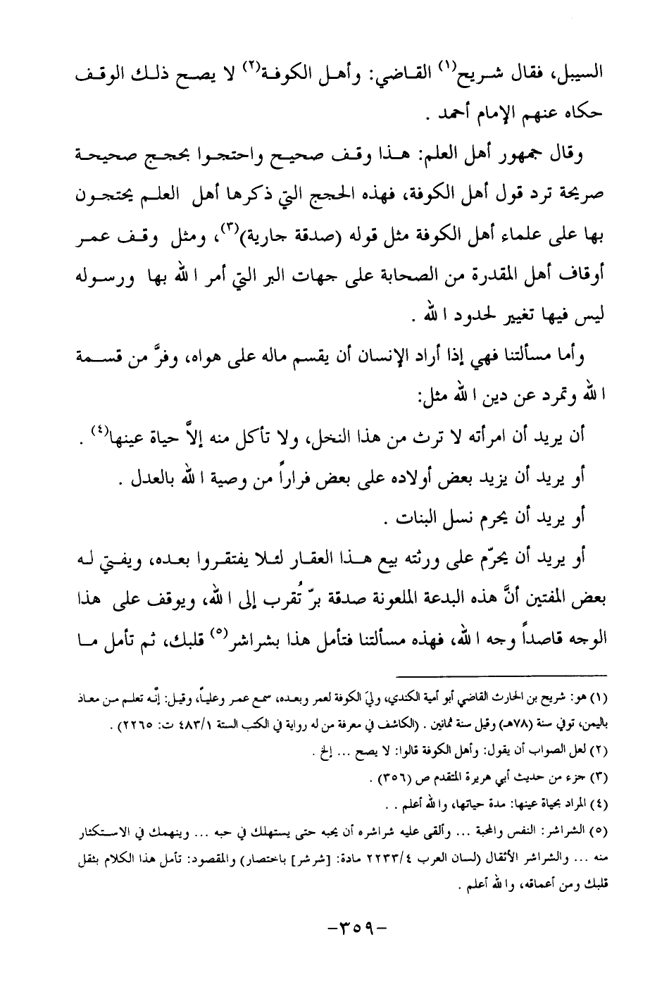 وقال جمهور أهل العلم: هذا وقف صحيح واحتجوا بحجج صحيحة صريحة ترد قول أهل الكوفة، فهذه الحجج التي ذكرها أهل العلم يحتجون بها على علماء أهل الكوفة مثل قوله (صدقة جارية) 3، ومثل وقف عمر أوقاف أهل المقدرة من الصحابة على جهات البر التي أمر الله بها ورسوله ليس فيها تغيير لحدود الله.