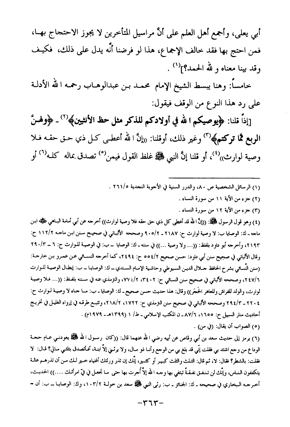 خامساً: وهنا يبسط الشيخ الإمام محمد بن عبد الوهاب رحمه الله الأدلة على رد هذا النوع من الوقف فيقول: