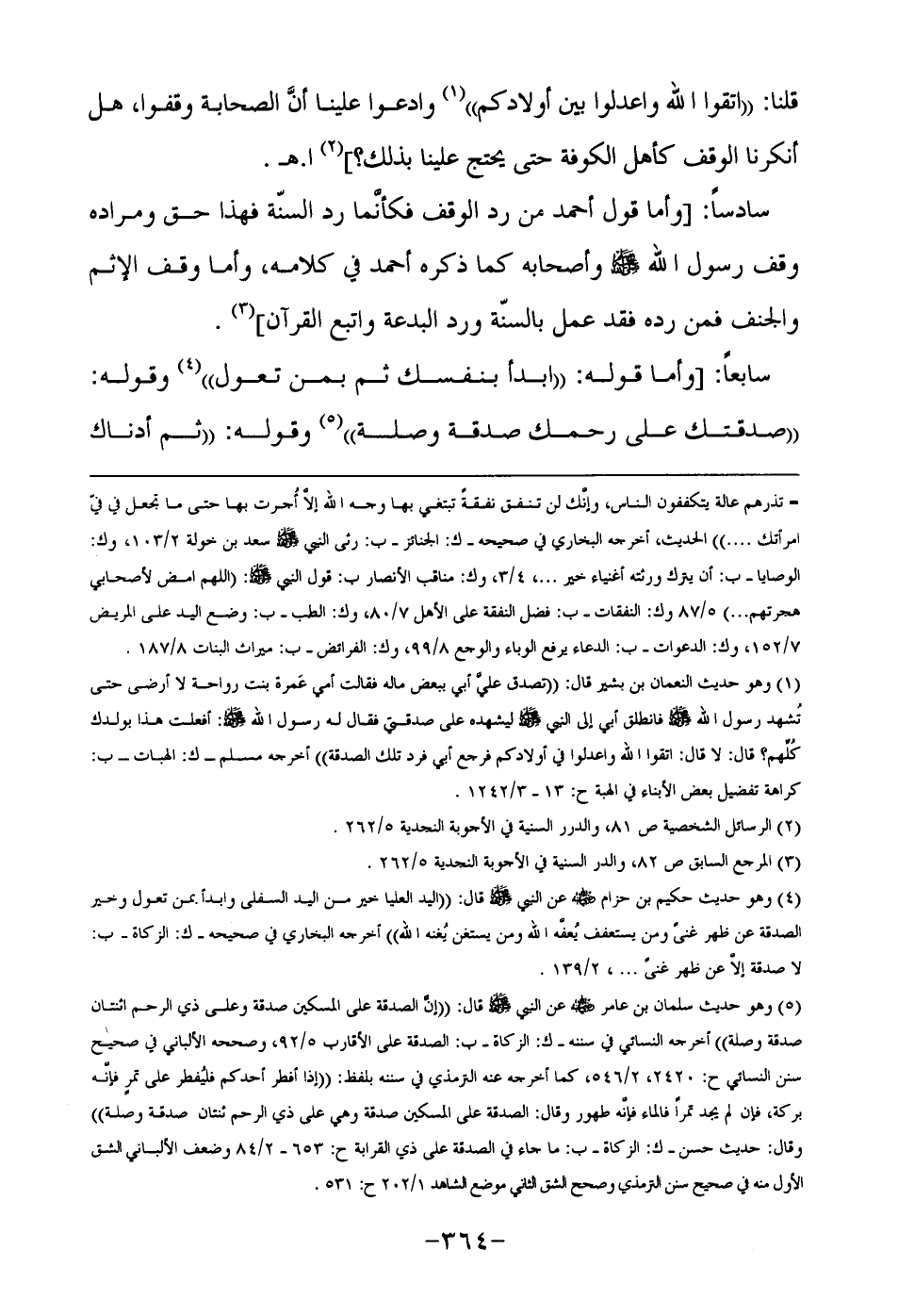 سادساً: [وأما قول أحمد من رد الوقف فكأنما رد السنّة فهذا حق ومراده وقف رسول الله صلى الله عليه وسلم وأصحابه كما ذكره أحمد في كلامه، وأما وقف الإثم والجنف فمن رده فقد عمل بالسنّة ورد البدعة واتبع القرآن] 3.
