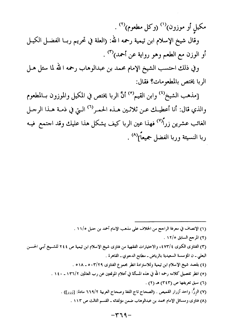 [مذهب الشيخ 4 وابن القيم5 أنَّ الربا يختص في المكيل والموزون بالمطعوم والذي قال: أنا أعطيك عن ثلاثين هذه الحمر6 التي في ذمة هذا الرجل الغائب عشرين زراً 7 فهذا عين الربا كيف يشكل هذا عليك وقد اجتمع فيه ربا النسيئة وربا الفضل جميعاً] 8.