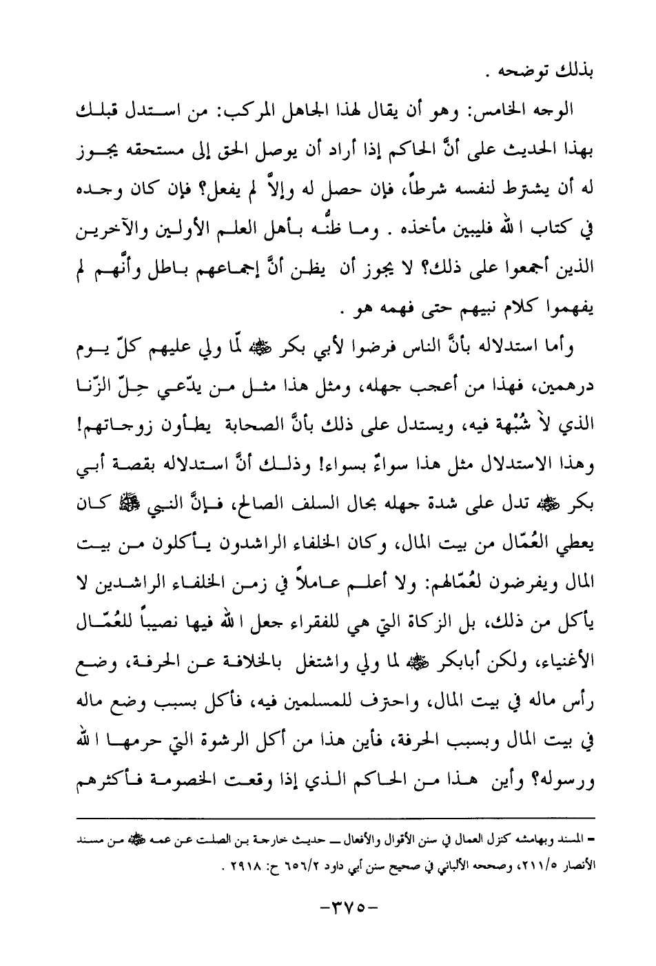 وأما استدلاله بأنَّ الناس فرضوا لأبي بكر رضي الله عنه لمّا ولي عليهم كلّ يوم درهمين، فهذا من أعجب جهله، ومثل هذا مثل من يدّعي حِلّ الزّنا الذي لا شُبْهة فيه، ويستدل على ذلك بأنَّ الصحابة يطأون زوجاتهم! وهذا الاستدلال مثل هذا سواءٌ بسواء! وذلك أنَّ استدلاله بقصة أبي بكر رضي الله عنه تدل على شدة جهله بحال السلف الصالح، فإنَّ النبي صلى الله عليه وسلم كان يعطي العُمّال من بيت المال، وكان الخلفاء الراشدون يأكلون من بيت المال ويفرضون لعُمّالهم: ولا أعلم عاملاً في زمن الخلفاء الراشدين لا يأكل من ذلك، بل الزكاة التي هي للفقراء جعل الله فيها نصيباً للعُمّال الأغنياء، ولكن أبا بكر رضي الله عنه لما ولي واشتغل بالخلافة عن الحرفة، وضع رأس ماله في بيت المال، واحترف للمسلمين فيه، فأكل بسبب وضع ماله في بيت المال وبسبب الحرفة، فأين هذا من أكل الرشوة التي حرمها الله ورسوله؟ وأين هذا من الحاكم الذي إذا وقعت الخصومة فأكثرهم