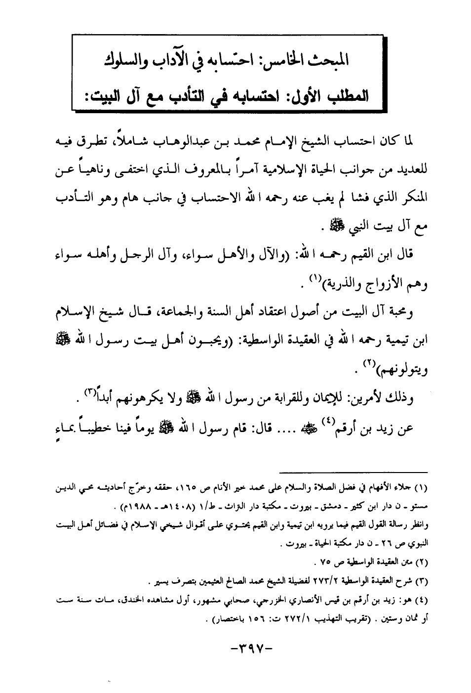 لما كان احتساب الشيخ الإمام محمد بن عبد الوهاب شاملاً، تطرق فيه للعديد من جوانب الحياة الإسلامية آمراً بالمعروف الذي اختفى وناهياً عن المنكر الذي فشا لم يغب عنه رحمه الله الاحتساب في جانب هام وهو التأدب مع آل بيت النبي صلى الله عليه وسلم.