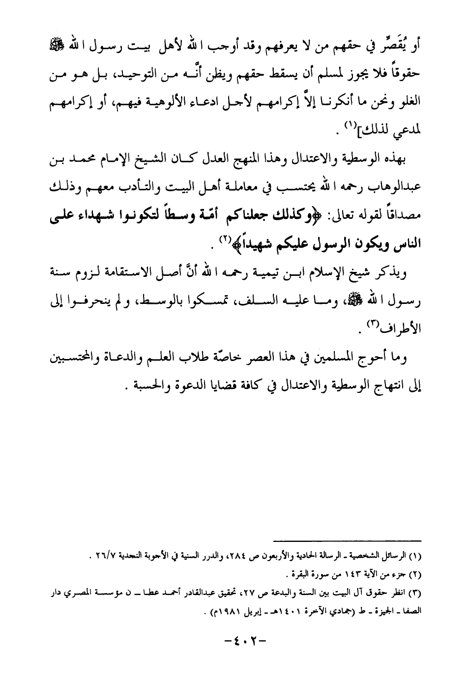 بهذه الوسطية والاعتدال وهذا المنهج العدل كان الشيخ الإمام محمد بن عبد الوهاب رحمه الله يحتسب في معاملة أهل البيت والتأدب معهم وذلك مصداقاً لقوله تعالى: {وَكَذَلِكَ جَعَلْنَاكُمْ أُمَّةً وَسَطاً لِتَكُونُوا شُهَدَاءَ عَلَى النَّاسِ وَيَكُونَ الرَّسُولُ عَلَيْكُمْ شَهِيداً} 2.